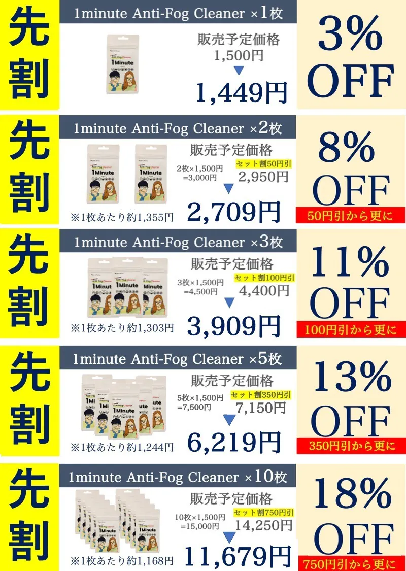 2023/12/07 18:30みなさま曇り止めクロス”1minute”事務局の今村です。ただいまよりプロジェクトを開始いたしました!【期間限定】抗菌効果!曇ったメガネを解消!進化版曇り止め"1minute"今回、世の中の物価高に対抗ということで、期間限定で特別価格にてご提供させていただきます。お求めやすくなっておりますため、この機会をご活用いただければと思います。本キャンペーンは、今回が最後になる場合がございますのでご了承下さい。ご希望の方はお早めにお買い求めくださいませ。引き続き、何卒よろしくお願いいたします! もっと見る【緊急告知】