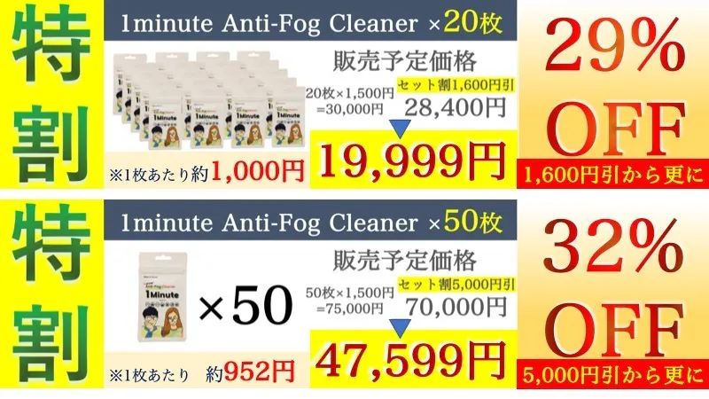購入後、多くの方々から再販を希望するお声をいただき、新商品として公開したいと願っておりました。あれから2年経過し、メーカー開発の元、新商品として1minuteを日本に上陸させていただく運びとなりました。私自身実際に曇る曇らないを数日間検証時、撮影で比較をさせていただいております。実行者自身もこの曇り止め1minuteがいかに便利でパワーUPしているかを体感した上で、今回このプロジェクト公開をさせていただいております。