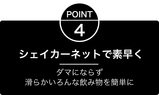 付属のシェイカーネットを装着してシェイクするだけで、簡単に素早くダマにならず滑らかに混合することができます。