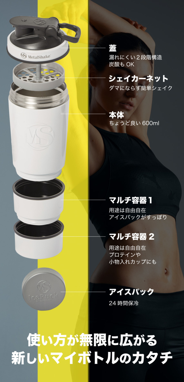 プロテインの他にも、ミックスジュースや米粉・食材などメタルシェイクなら、シェイカーネットと漏れない構造で、滑らかで飲みやすいドリンクがすぐに作れます。