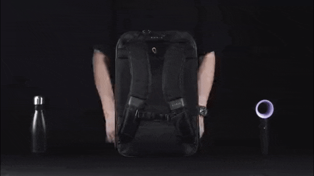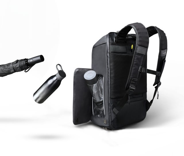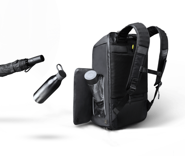 隠しポケットとメインコンパートメントは水に強い生地で区分けされており、使用済みの傘や水滴のついたペットボトルをお入れいただくこともできます。