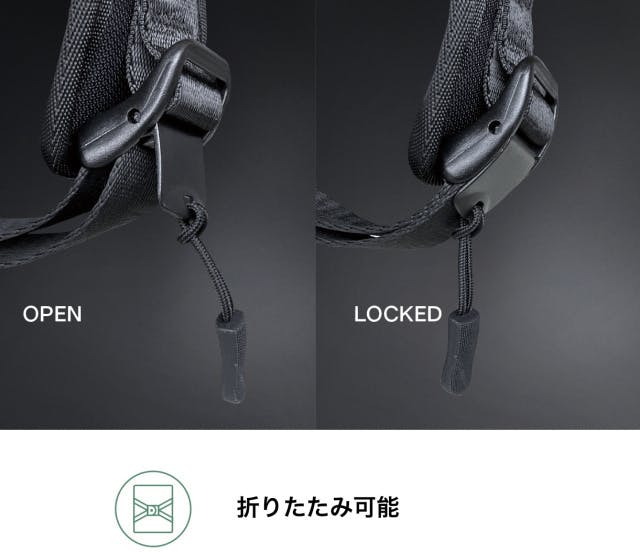 今回のモデルからショルダーストラップに採用したバックルはロック式となり、ドローコードを引っ張りロックを解除するとストラップが自由に動くため、背負ったままでも簡単にサイズ調整ができ、ギュッと握ってロックするとストラップがしっかり固定され長さがずれにくくなります。