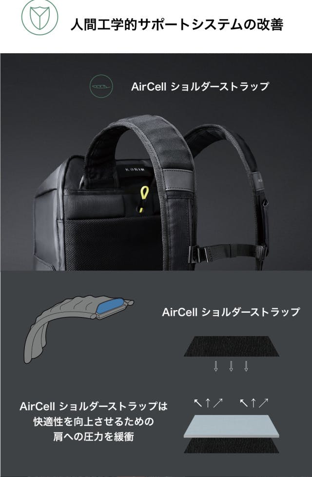 ショルダーストラップにはシルバーの「KORIN」というロゴはリフレクターになっており、夜間はライトに反射し、車などにあなたの存在を知らせてくれます。