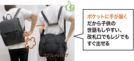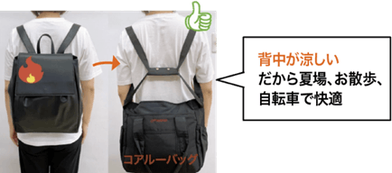 通常のリュックは、荷物の出し入れが不便だったり背中が暑くなりがちですが、コアルーのリュックスタイルなら背中が空くため暑くなりにくくとても夏場でも動きの多い時でも汗をかきやすい方にもおススメです。