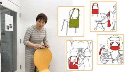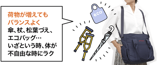 前抱えは意外なことにとても色々なシーンで便利なのでぜひ体験して頂きたいものです。長時間立っているとき、電車など座っている姿勢で(車いすも、傘や杖を持つ時も)、エコバッグやリュックとの併用で、人混みの中、ATMやレジ前での財布の出し入れ、カメラやケイタイの操作も爆ラク!