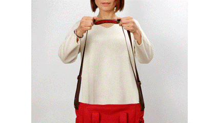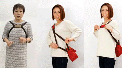 コアルーは特許取得のベルトの構造で、引っ張るだけで、腕を入れるだけで掛け方を簡単に変えることができます。1本で5通り。付け替えも不要、出し入れなどの面倒も不要。そんな魔法のような使い方を可能にしたのは、真ん中の動くパッド。真ん中にある時には1本のベルトに見えるけど、動くと二重になっている両側のベルトに腕を入れる空間ができるのです。