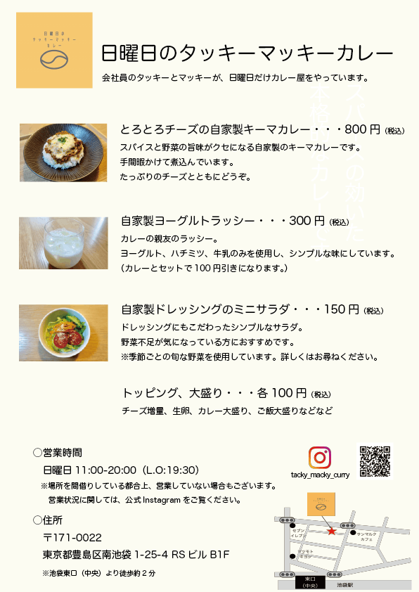 池袋で間借りカレー屋「日曜日のタッキーマッキーカレー」のオープンを目指している大澤 樹希(おおさわ たつき)と牧田 凌(まきた りょう)と申します。