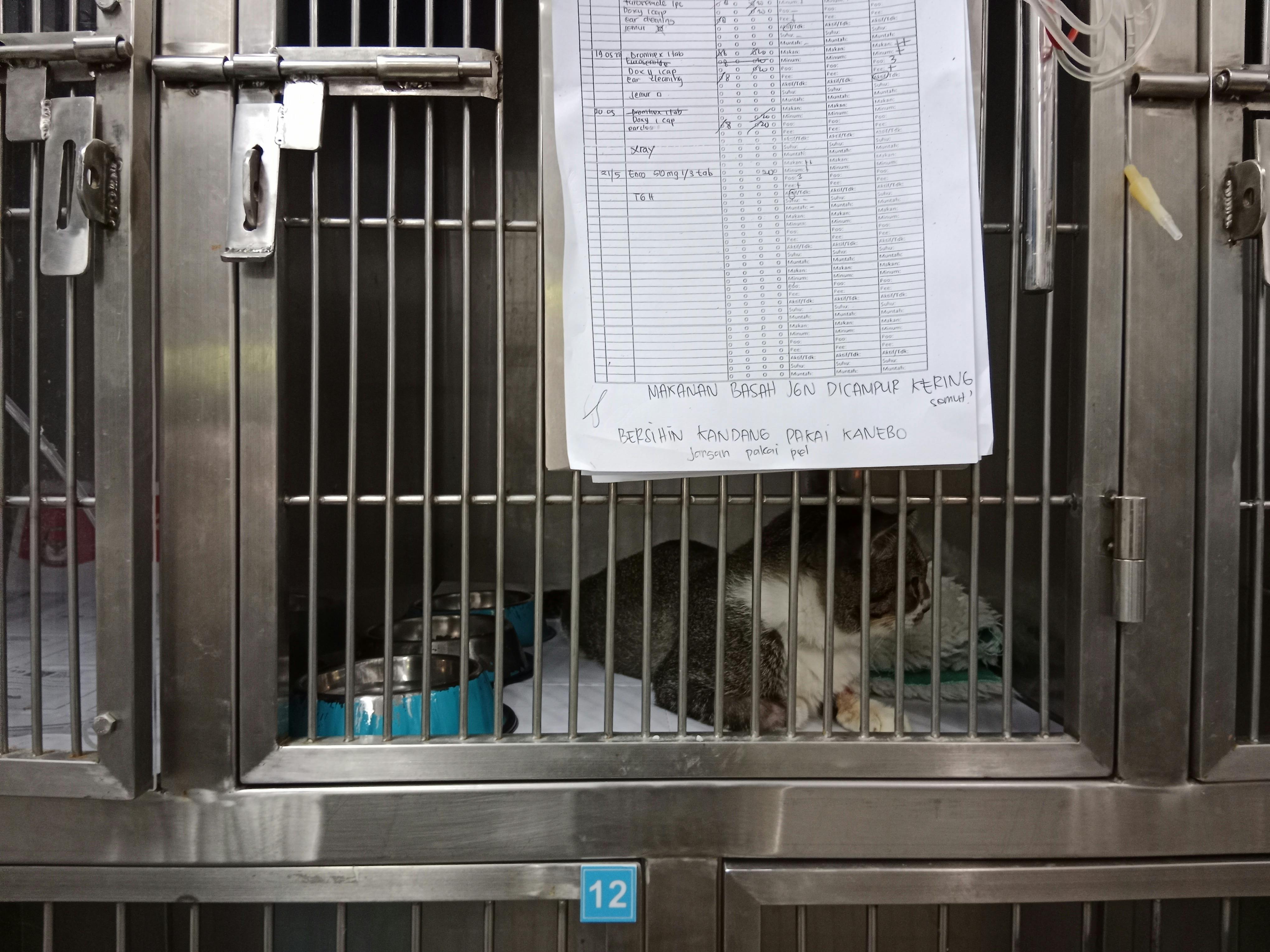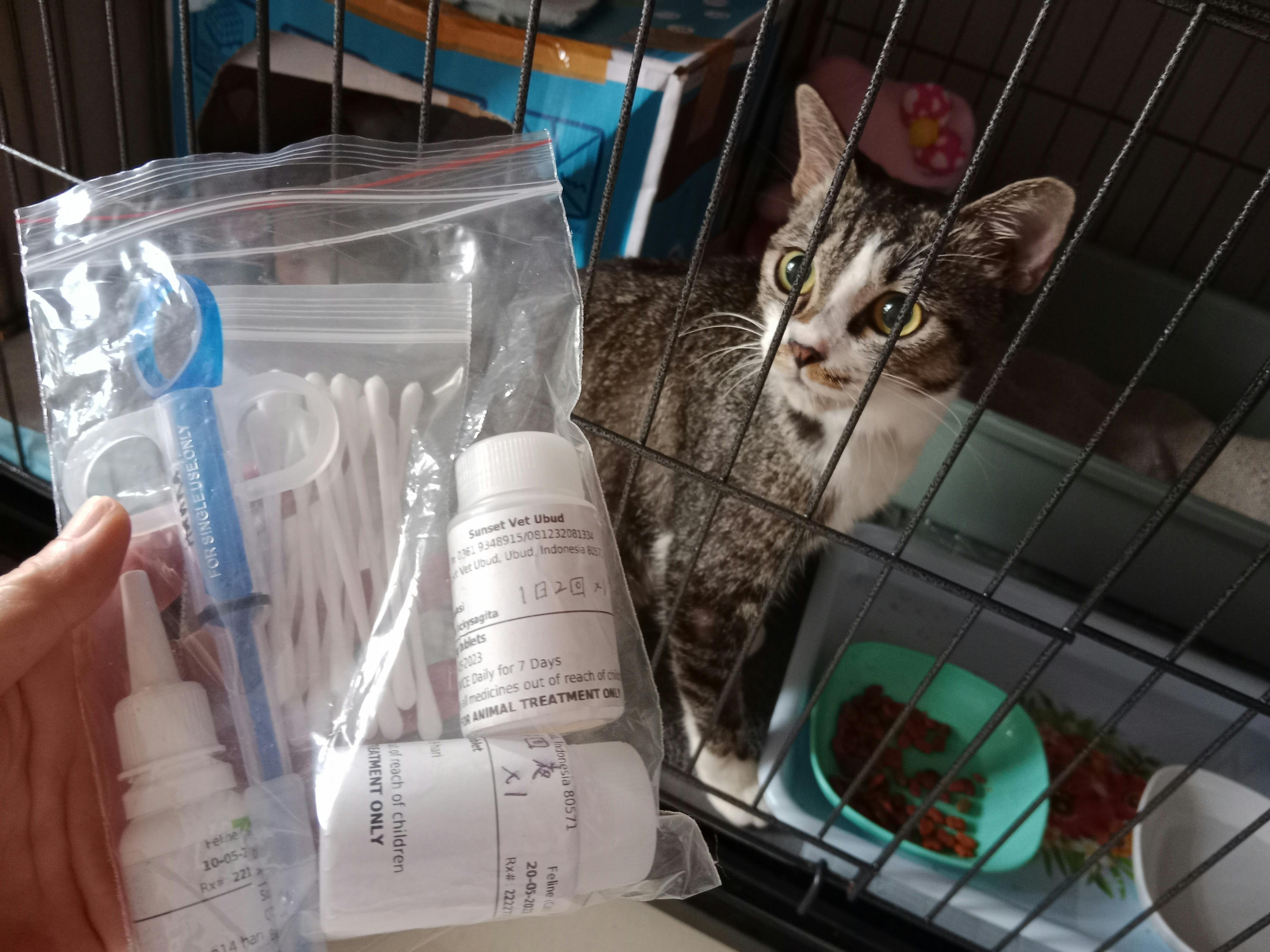 ニュピ明けでしたので開いている病院を確認して連れて行きました。先生に状況をお話し検査して貰ったら猫パルボウイルスの陽性で即隔離入院となりました。
