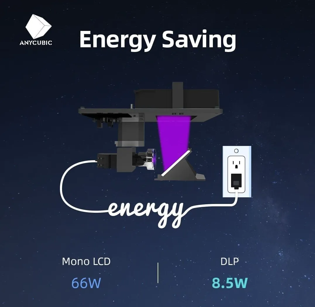 また、Anycubicによると、Ultraの方がはるかにエネルギー効率が高いとのことです。LCDベースのプリンタが通常動作する光効率の10倍で作動し、エネルギー消費も少なくて済みます。