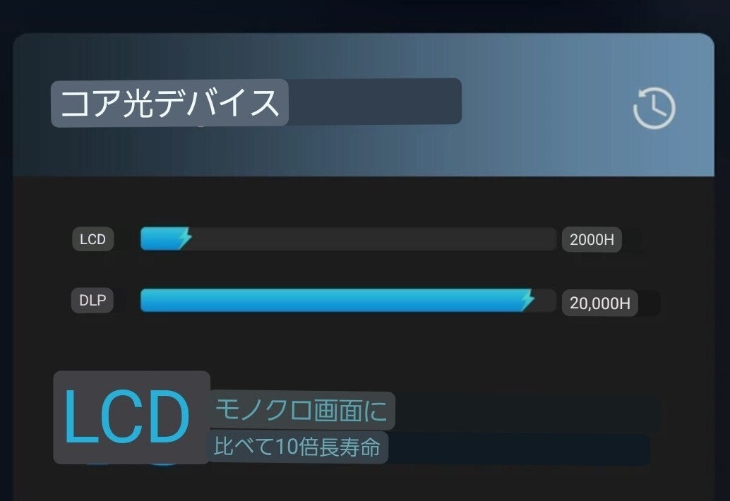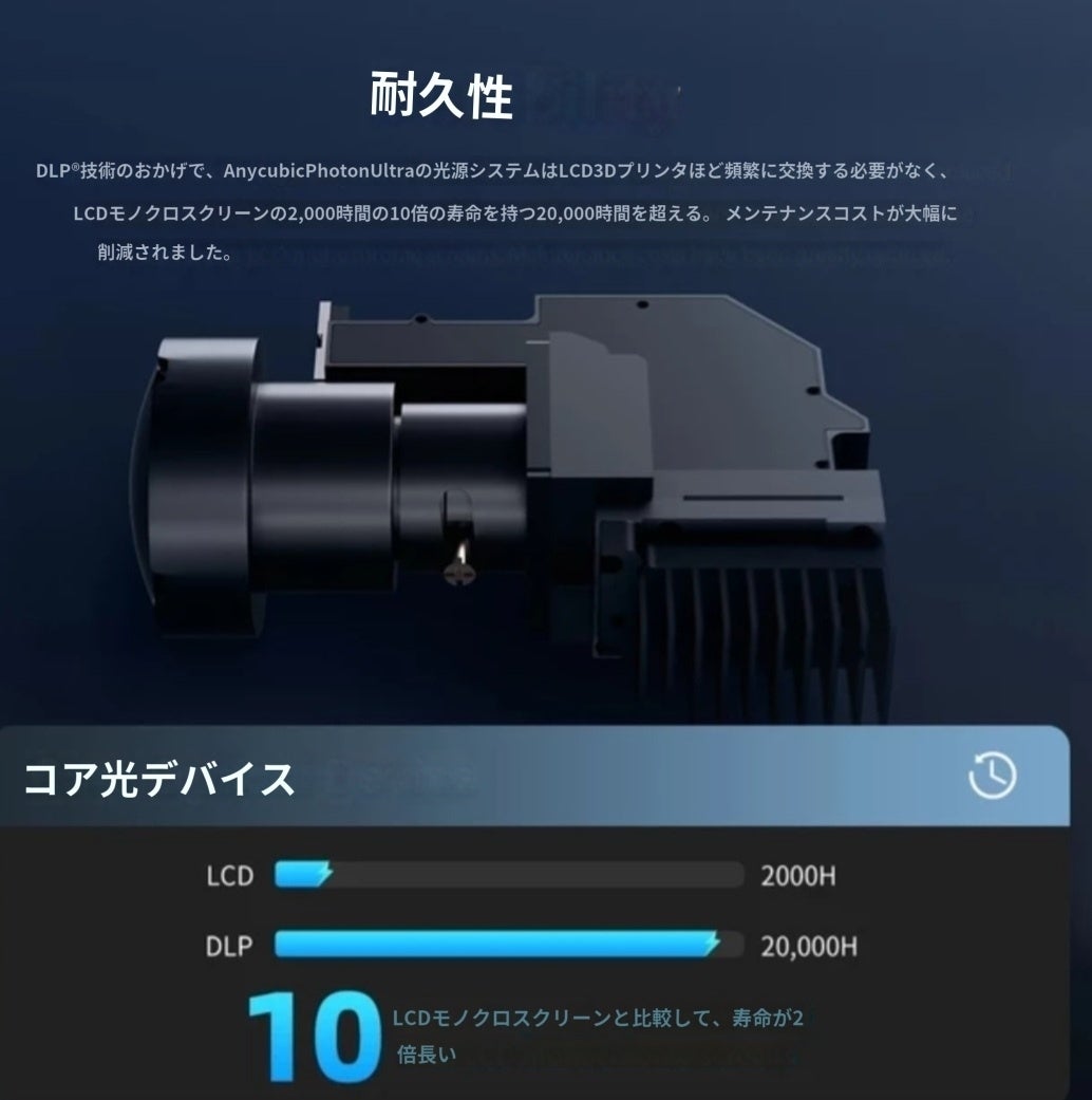 LCDスクリーンは消耗品で、3-5カ月ごとに交換が必要であり、新たにスクリーンを購入しなおさなければなりません。Anycubic Photon UltraにはLCDスクリーンがなく、内蔵プロジェクターで2万時間以上のプリンター使用が可能です。