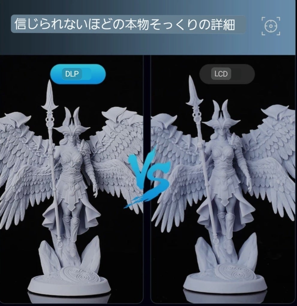 細い線や小さなサイズのテキストを表示する場合、DLPプリンターはLCDプリンターより、よりピュアな色とより豊かなレイヤーで鮮明に表示できるため、モデルの質感がより繊細になり、コーナーもよりシャープに描写できます。