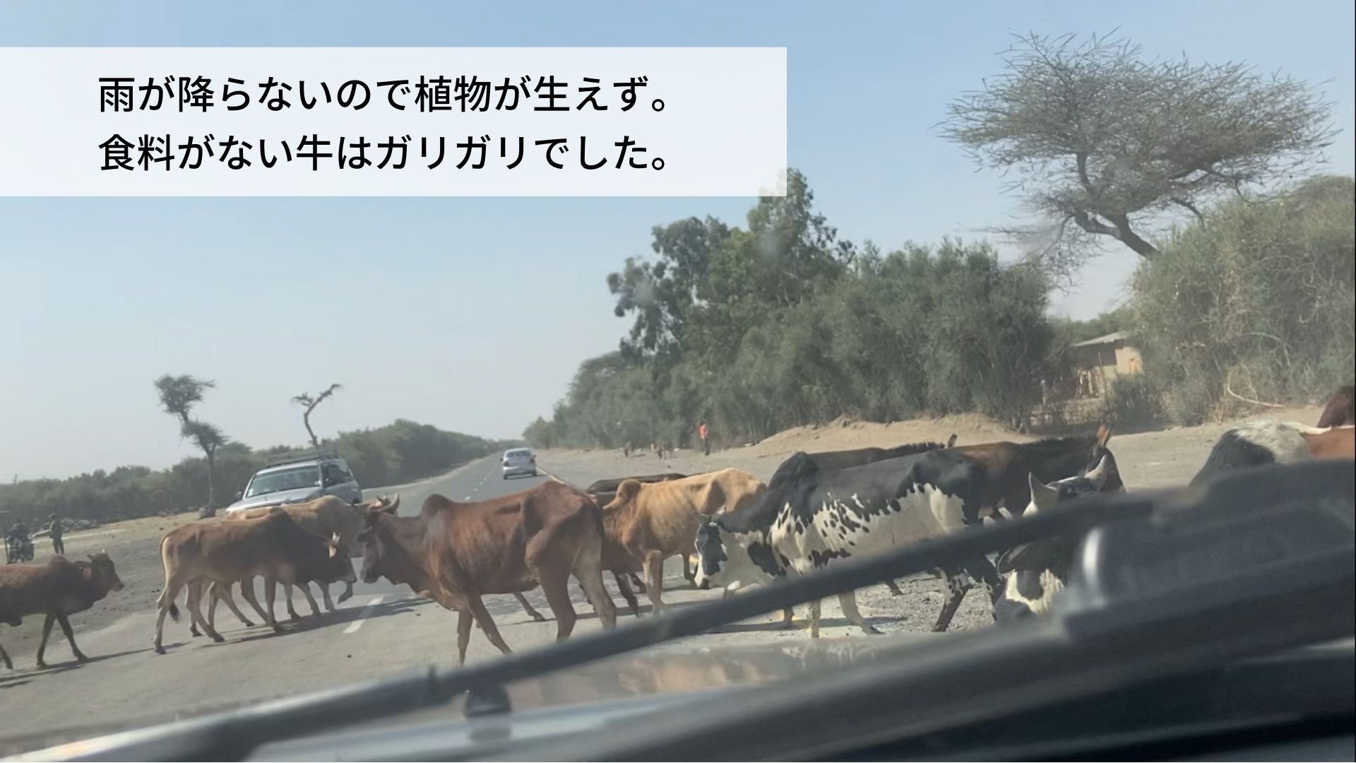 雨が全く降らず、植物が育たないので、食料のあてがない牛はガリガリでした。