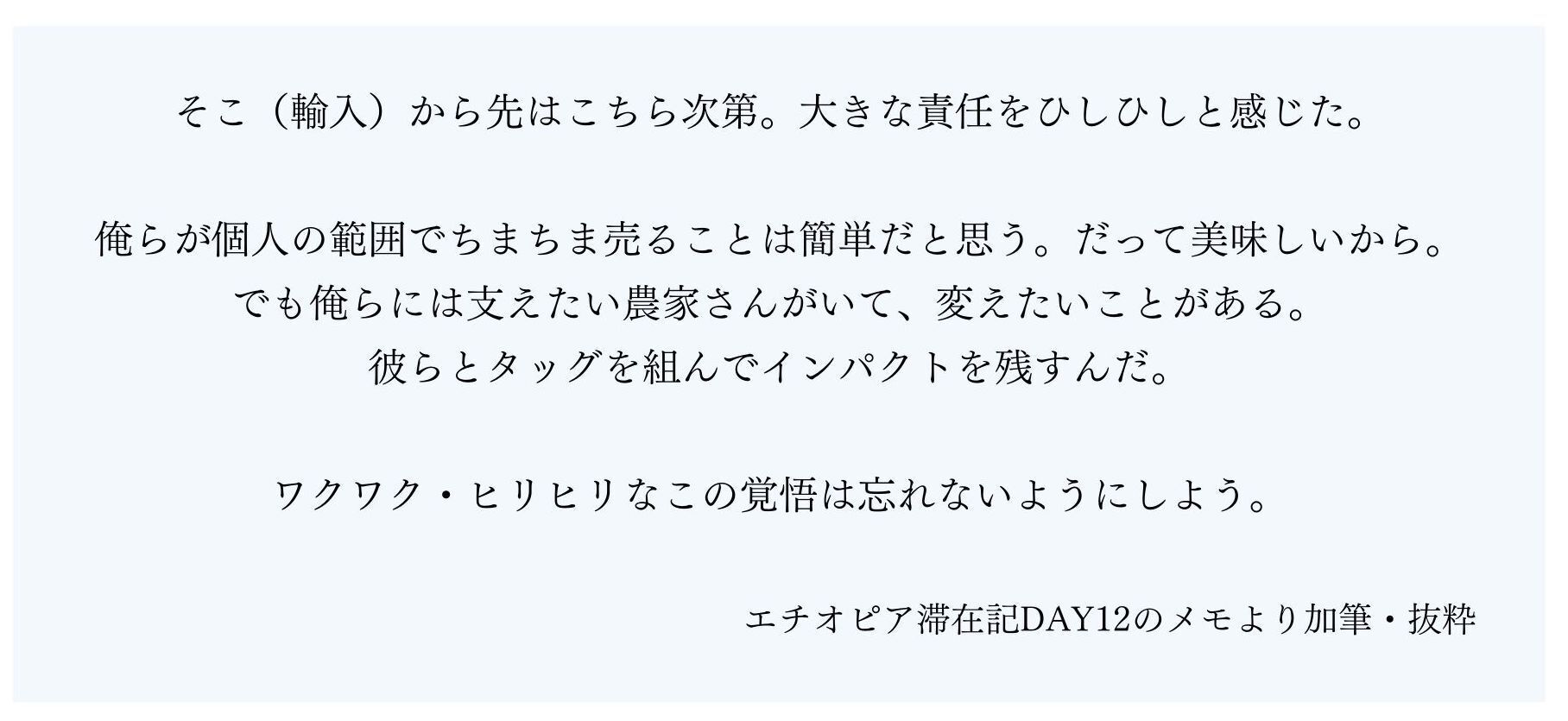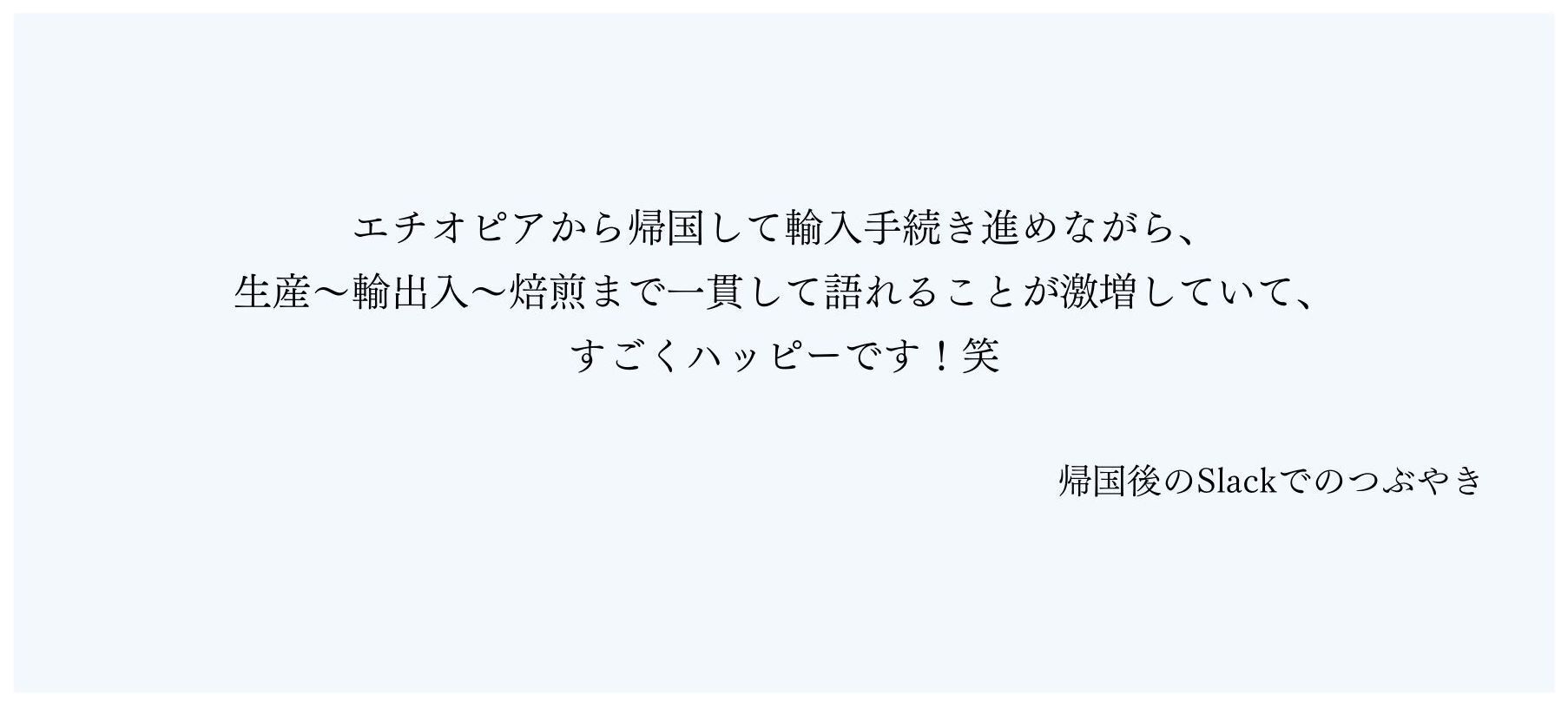 そして生産国で踏ん張る彼らと肩を組んで、僕らも消費国で頑張ろう!と、見据える未来を共有したりしました。