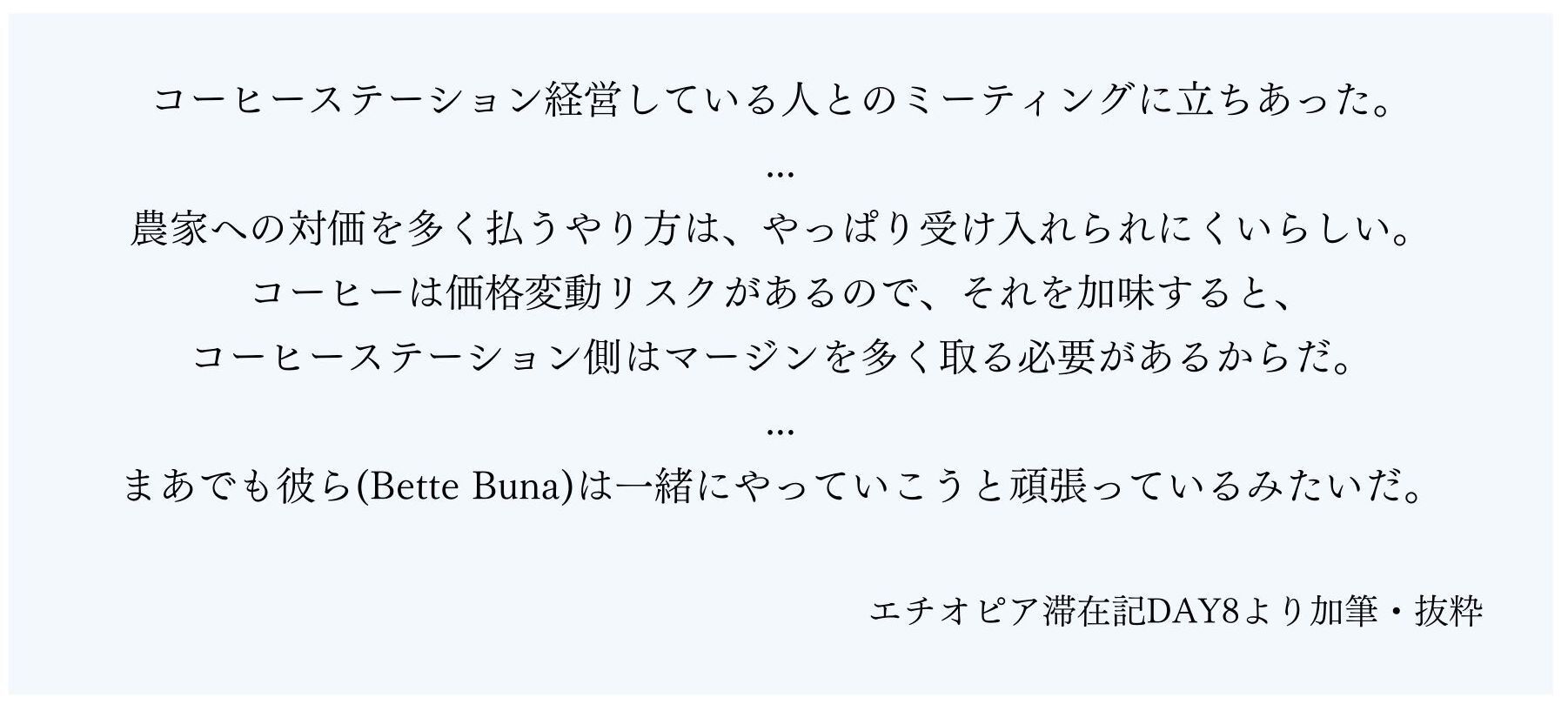 Bette Buna(House of Coffeeの意味)という会社名でコーヒーの課題に挑戦している人達と出会いました。彼らは生産から輸出まで一貫して取り組んでいます。