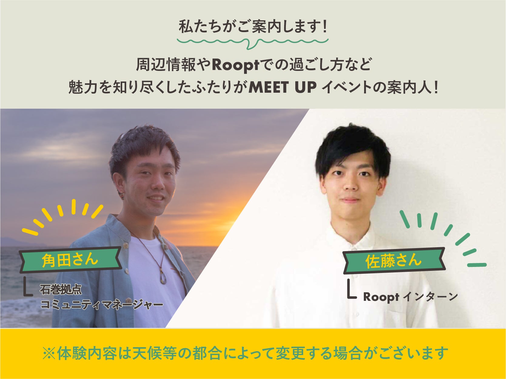 Rooptへの滞在や周辺地域の魅力を体験し、参加者や他の居住者とも交流ができるMEET UPイベントの参加チケットです。
