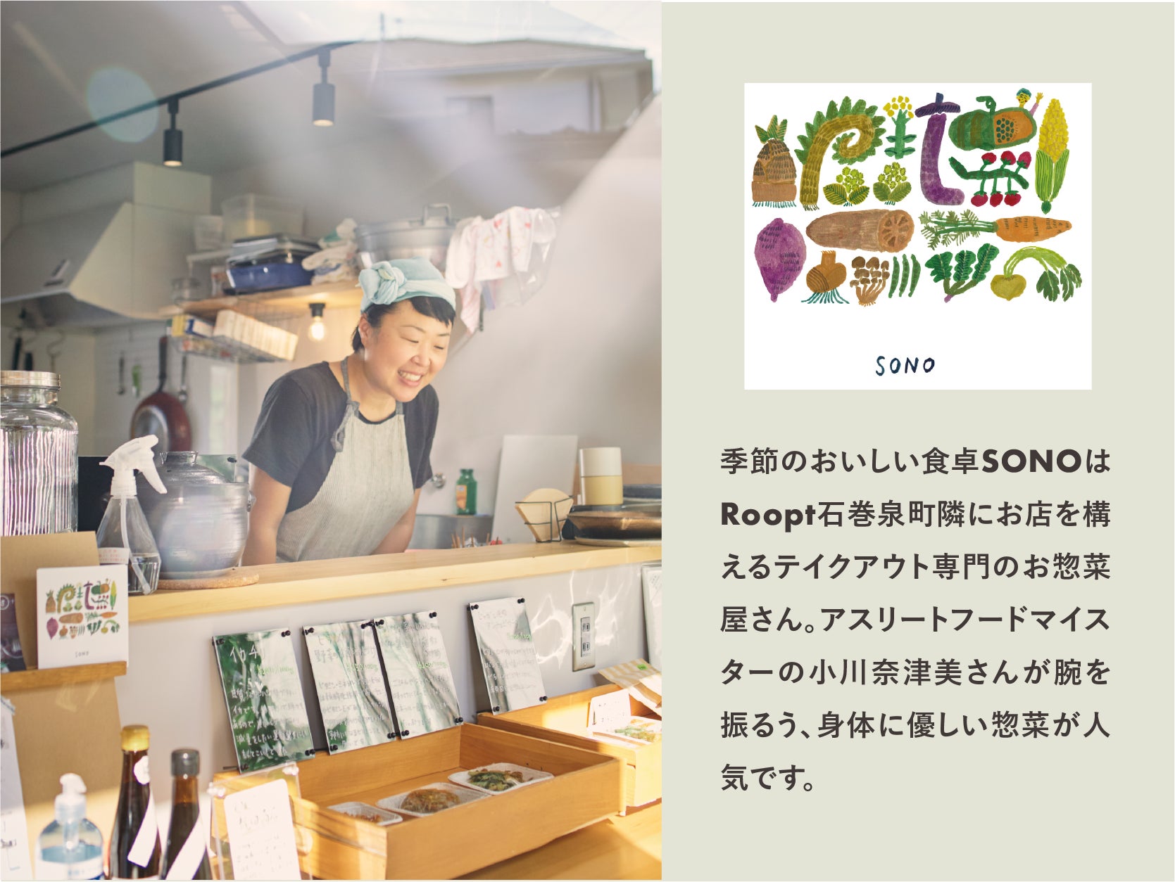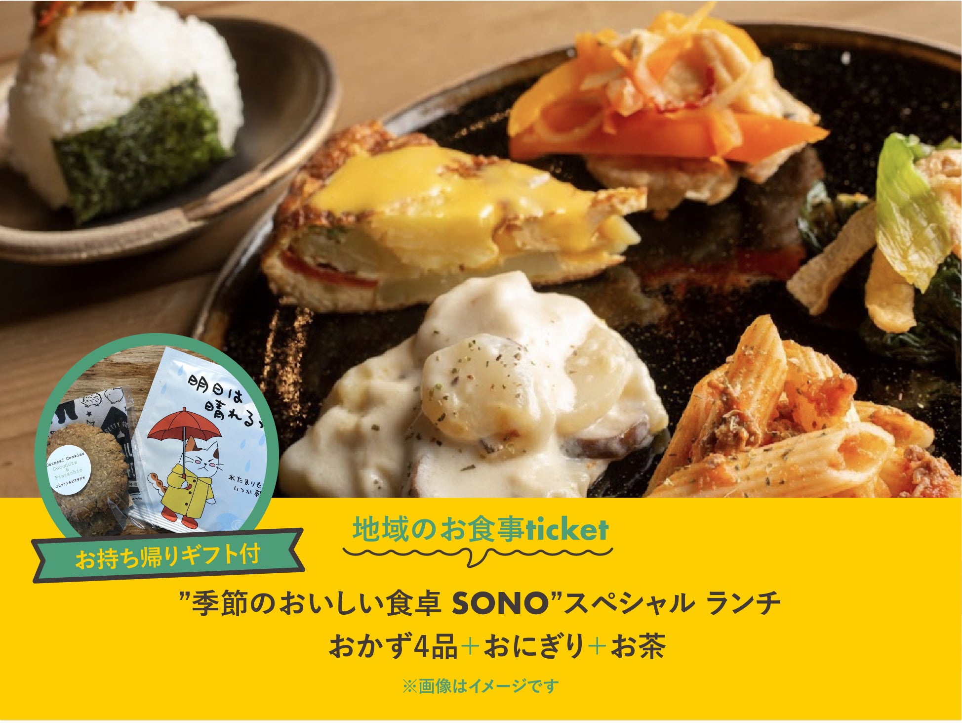 宮城県石巻市内のRooptに近接するお総菜屋さん「SONO」で2000円相当のランチとお土産の提供が受けられるチケットです。