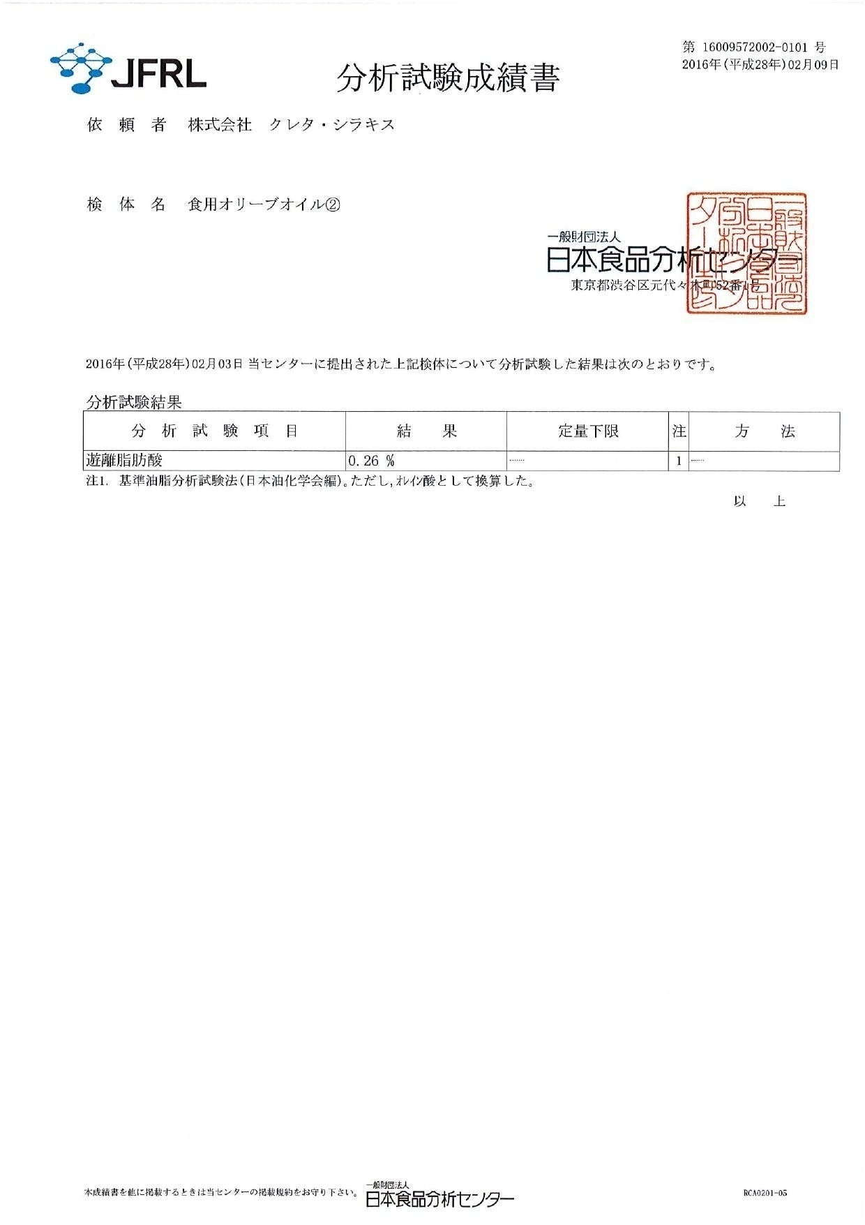 商品が国内へ到着した段階で、さらに日本の食品分析センターへ検査を依頼し、品質証明を取っております。(下記分析試験成績書・遊離脂肪酸=酸度)