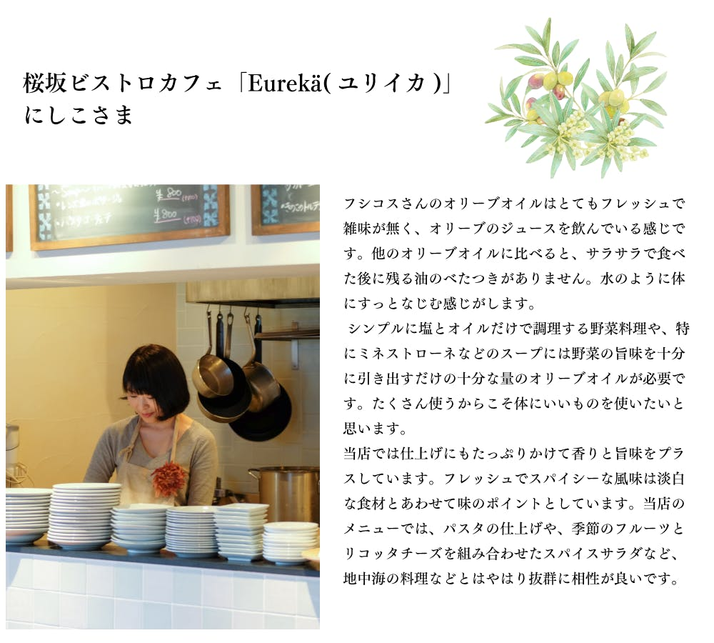 エキストラヴァージンオリーブオイル「フシコス」の創業者デミトリ・シラキスは、故郷であるギリシャから現地でしか食べることが出来ない、オリーブオイルの中でも一番上の等級であるエキストラヴァージンオリーブオイルを輸入販売しています。