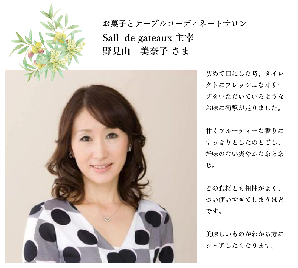 みなさまに本当のオリーブオイルのおいしさを味わっていただき、毎日の食事がより豊かで楽しく、そしてなにより、健康的になることを願っています。