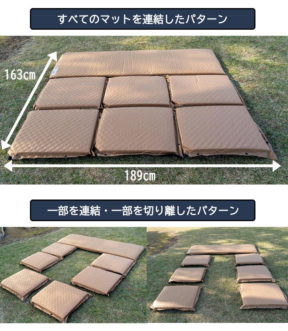 キャップを緩めるだけで、自動でエアーが注入、排出できるので準備も手間いらず。マット同士もボタンをそれぞれ留めるだけで連結できます。