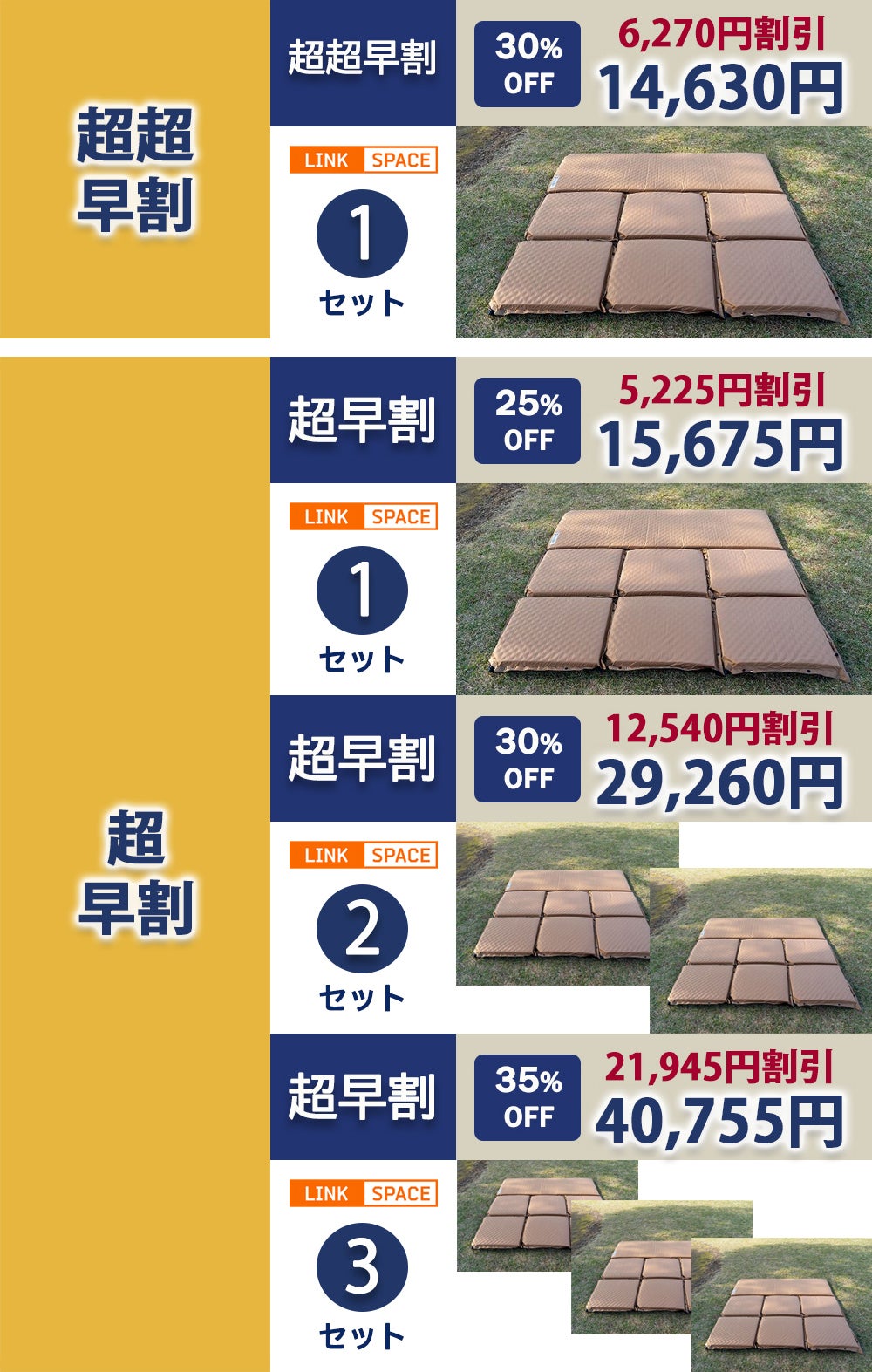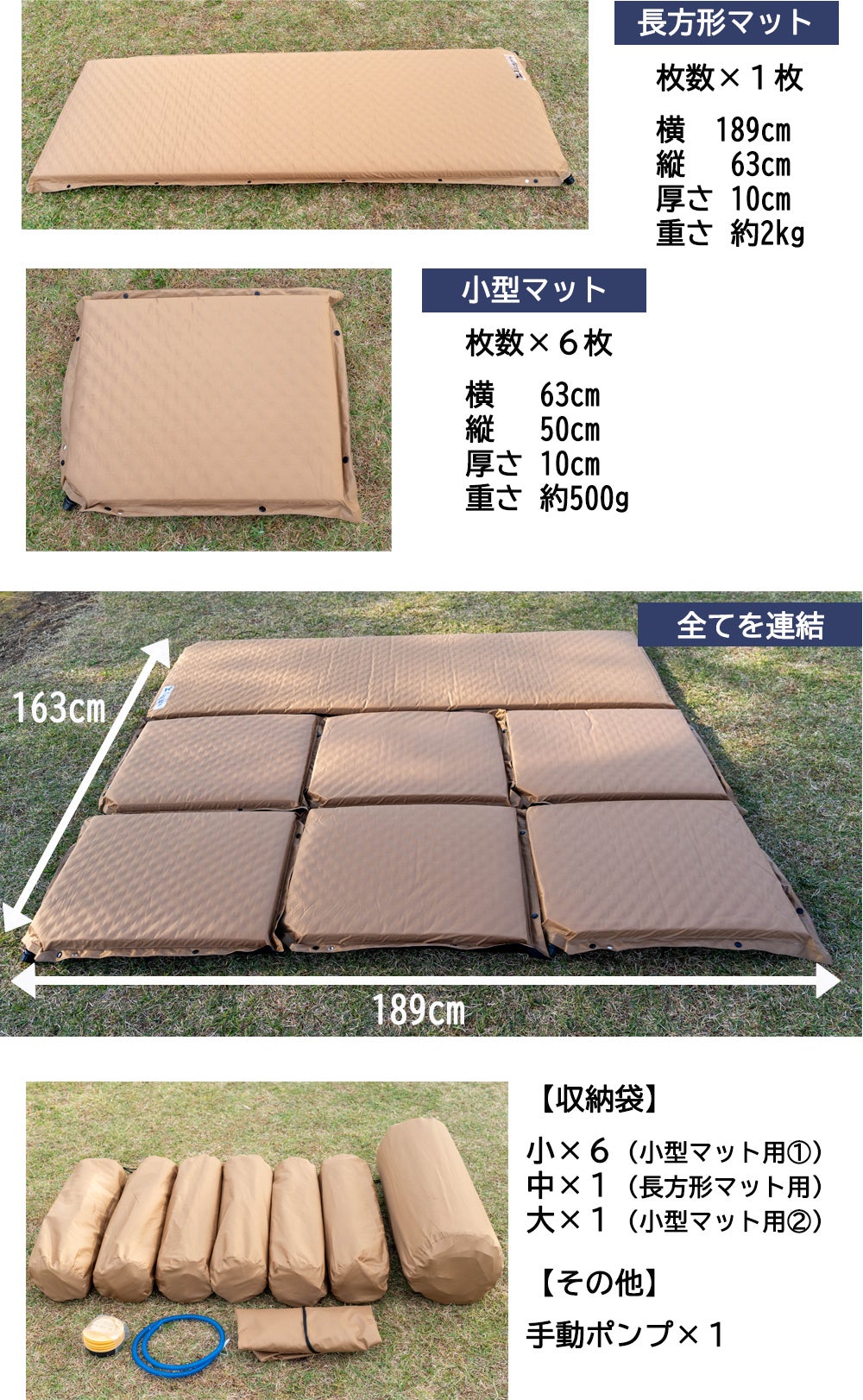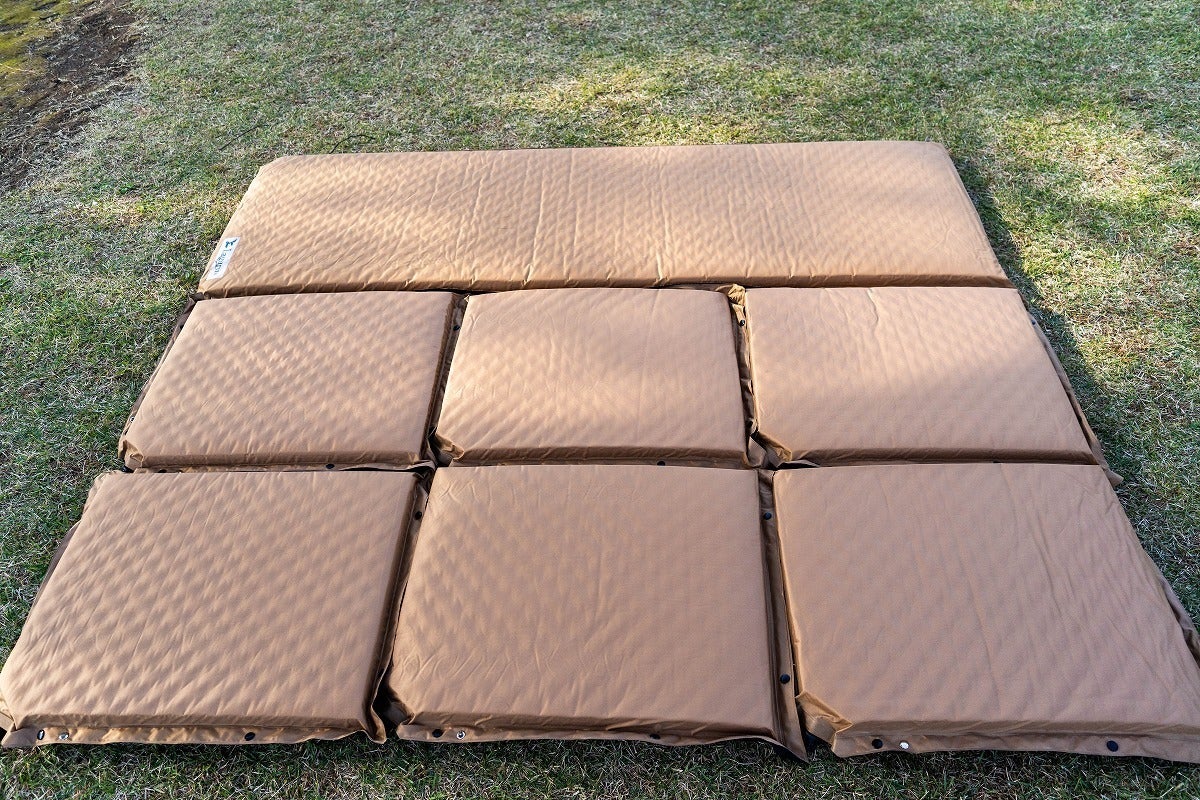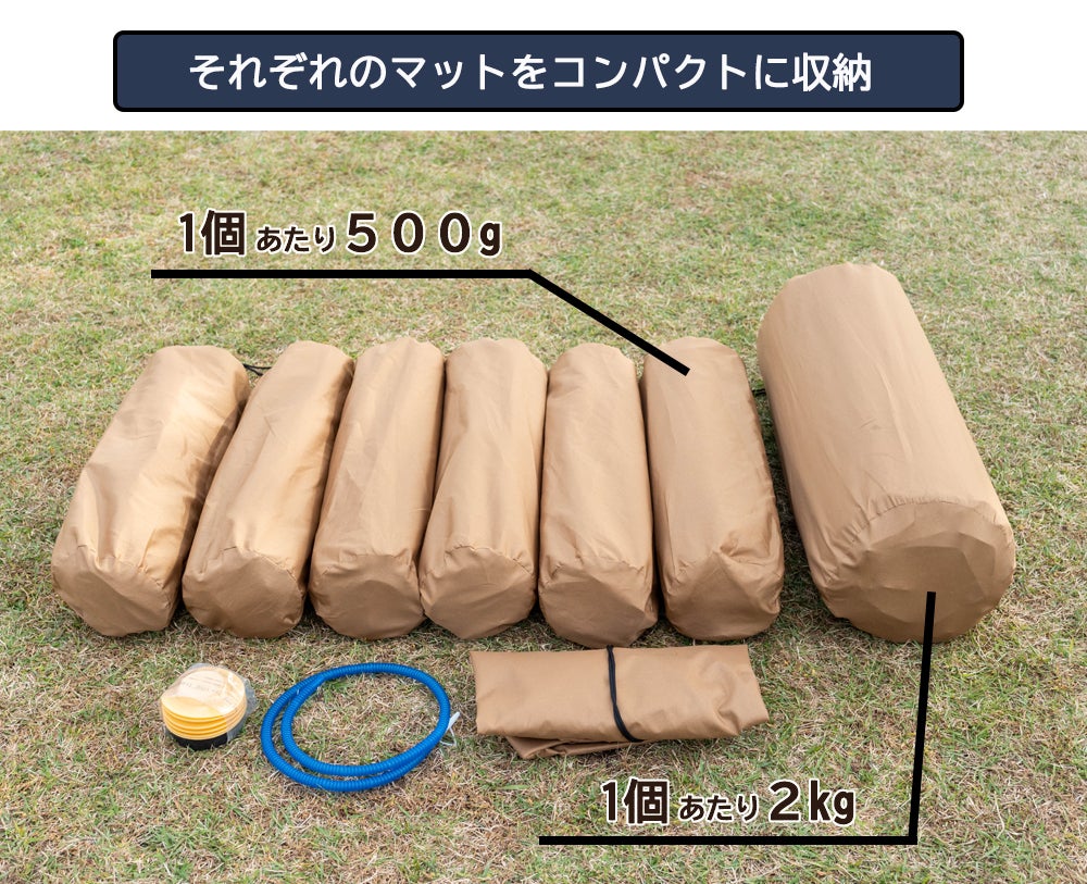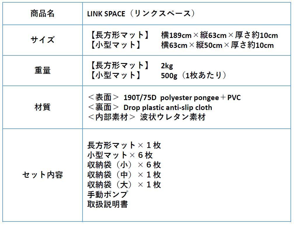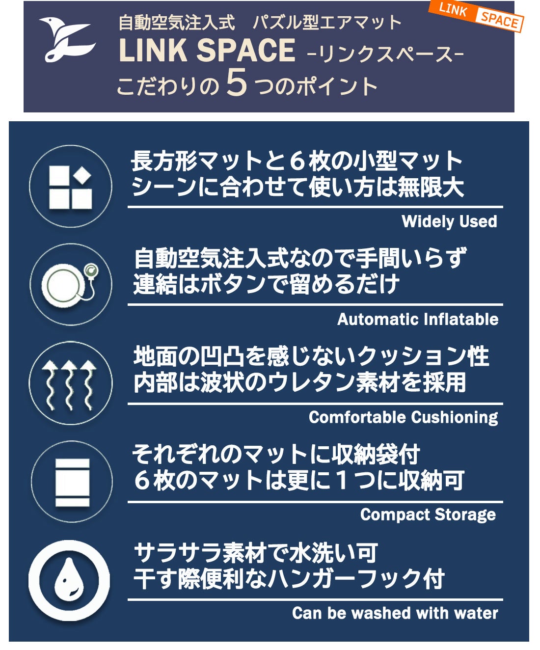 LINK SPACEは長方形のマットと6枚の小型マットを自由自在に連結できる、空気自動注入式パズル型エアマットです。