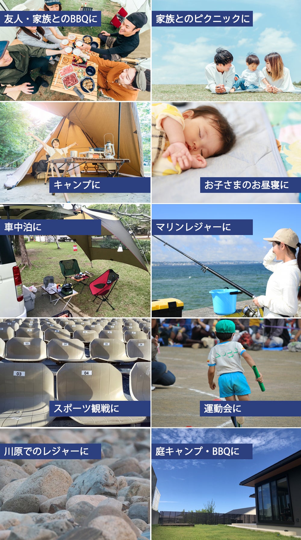 組み合わせや使い方はご利用シーンに合わせることが出来るので、あなたの快適な「おそと時間」を演出します。使用時の快適性だけではなく、持ち運び、組立、収納、洗濯に至るまで、徹底したユーザー視点で設計しました。