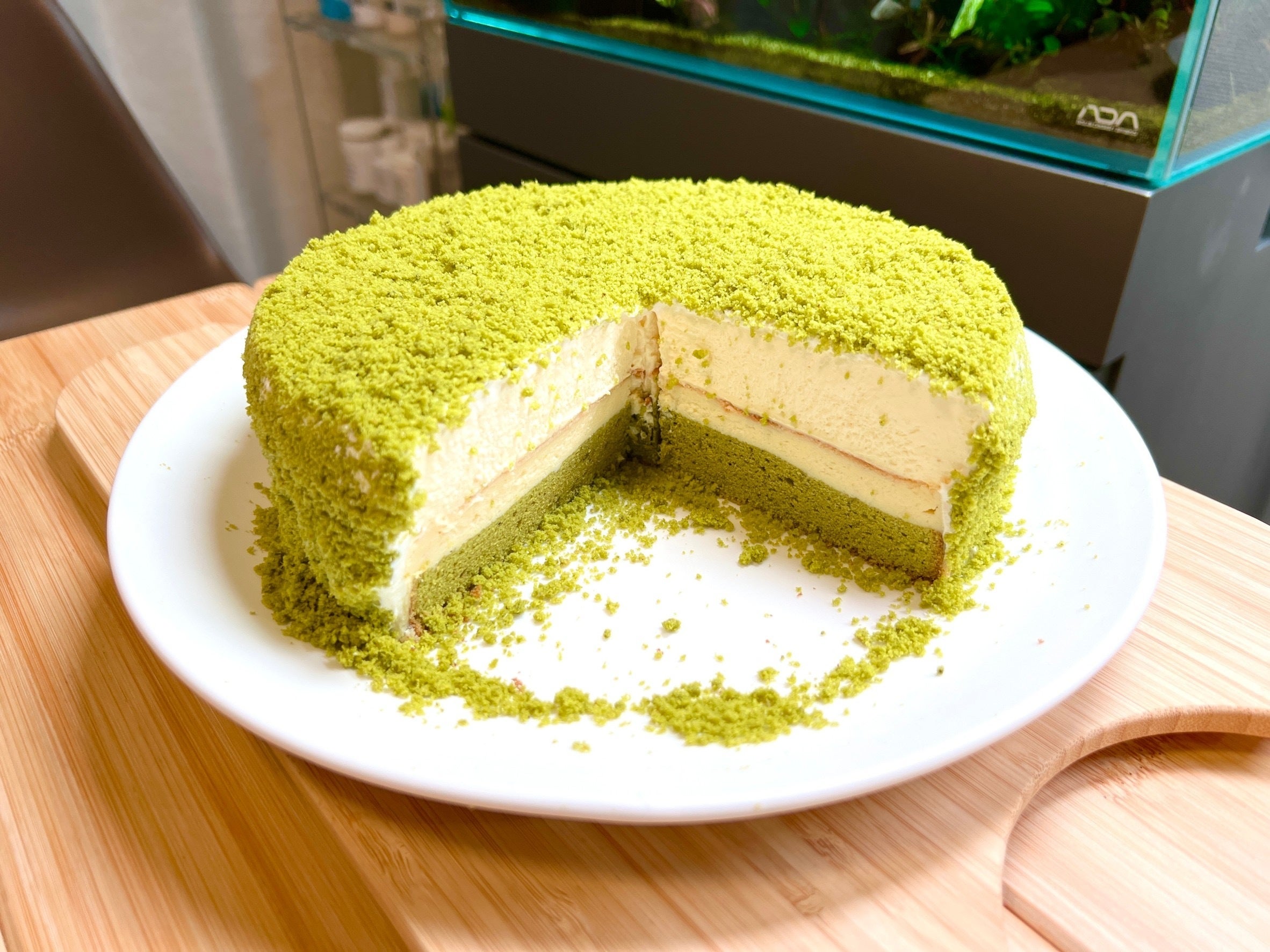 抹茶スポンジ・ベイクドチーズケーキ・レアチーズケーキの3層になっています。