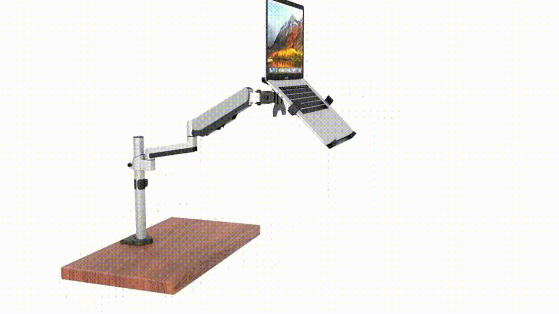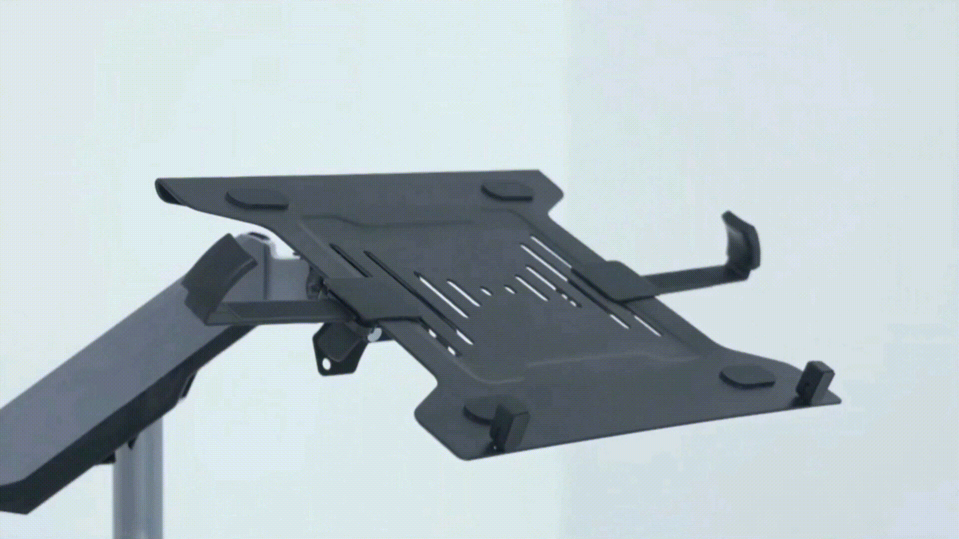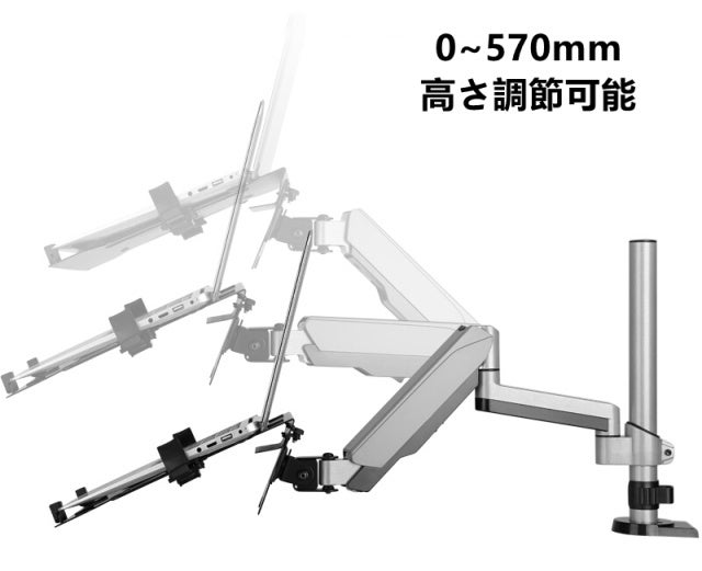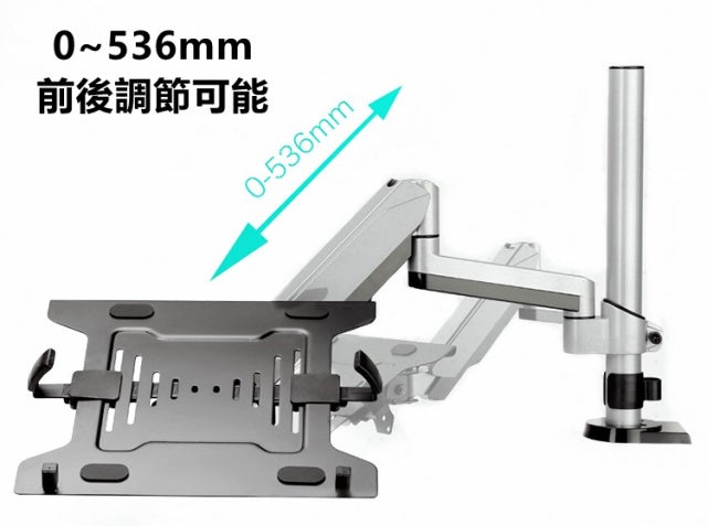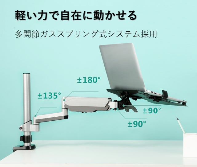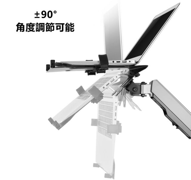 アーム式ノートパソコンスタンドを利用することで、ノートパソコンの目線の高さの微調整が必要な時に非常に便利です。水平に±90度、垂直面傾斜も±90度調節が可能です。ノートパソコンは差し込むだけですが、しっかり固定するストッパー付きで安心性にもこだわりました。