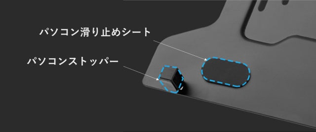 ノートパソコンをしっかり固定できるストッパーと滑り止めシート付きで、アームを動かす際も安心してお使いいただける設計です。