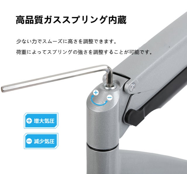更に、本ガス圧式アームは高品質ガススプリング内蔵、少ない力でスムーズに高さを調整できます。荷重によってスプリングの強さを調整することが可能です。ノートパソコンが軽い時、ネジをマイナス方向へ回し、ノートパソコンが重い時、ネジをプラス方向へ回します。