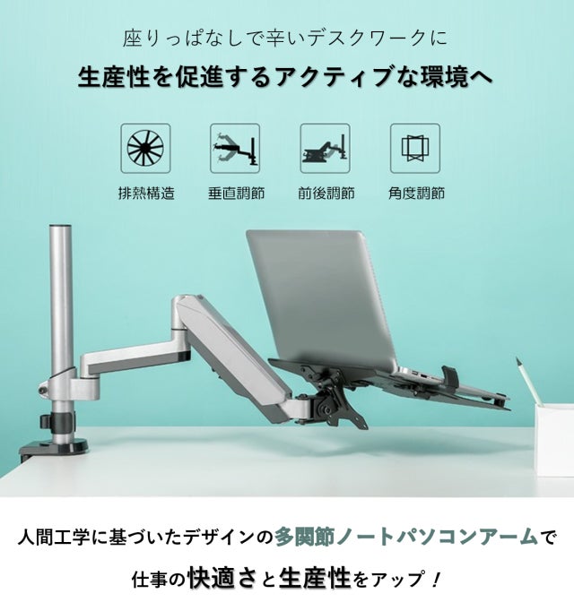 アームの購入のみで、手軽に作業環境を整えられる点も魅力です。また、スタンドで本体を浮かせるためノートパソコン使用時の排熱がしやすく、冷却効果も期待できます。