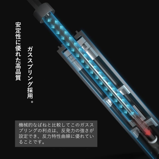 セルフロック付ガススプリング技術でわずかな力で手前に引き寄せたり、上下に動かすことができます。アームの内部に高圧ガスが封印されています。そのガスの圧力をバネとして利用し、反発する力で動かします。この反発する力が非常に強力なため、重いモニターでも小さな力で持ち上げたり押し下げたりすることができるのです。