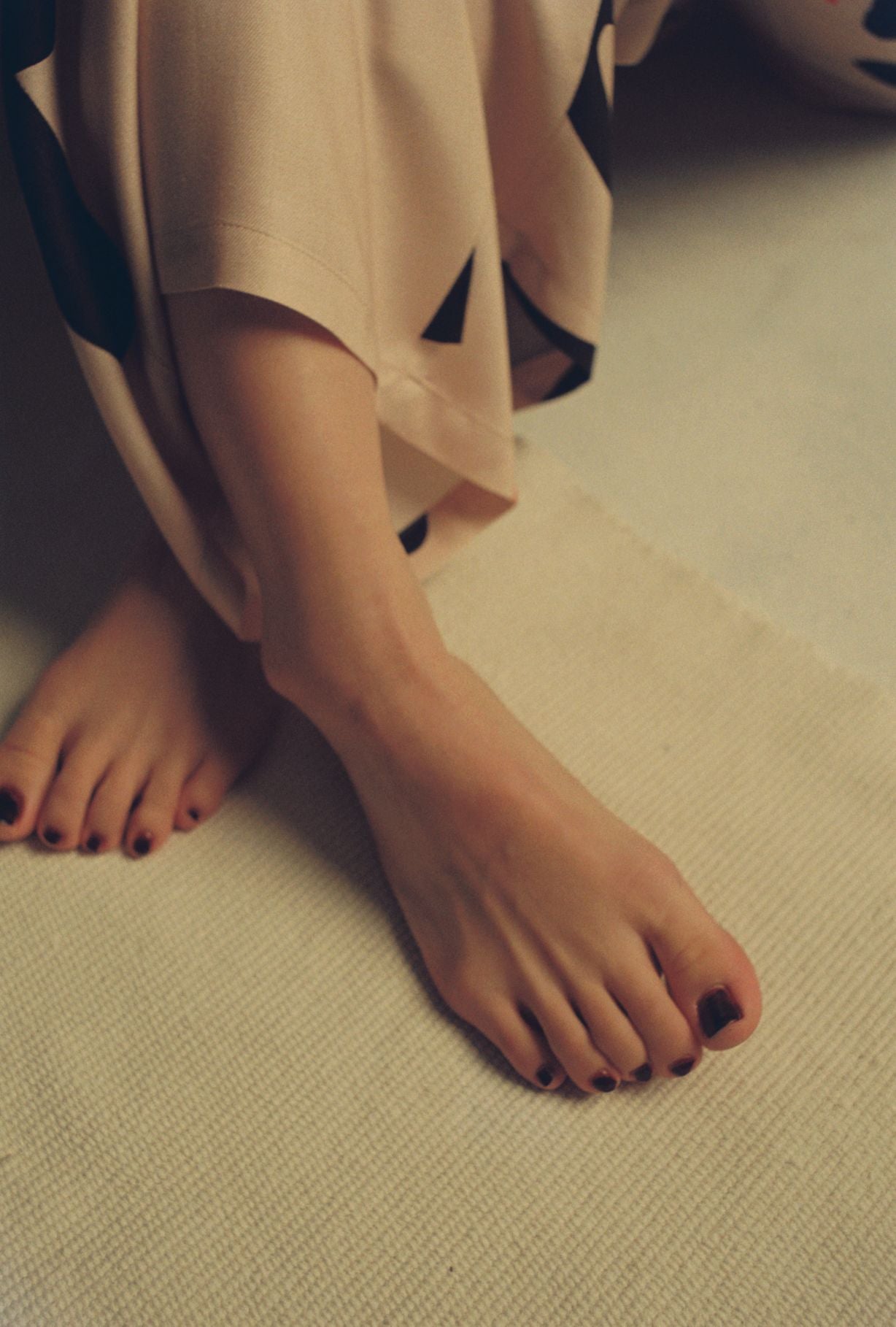 今回もそんな艶感、落ち感は踏襲しつつ、開襟ではなく上までボタンを止められるようなディテールや、ルームウェアながら外に着て行っても違和感がないようなデザインになっています。