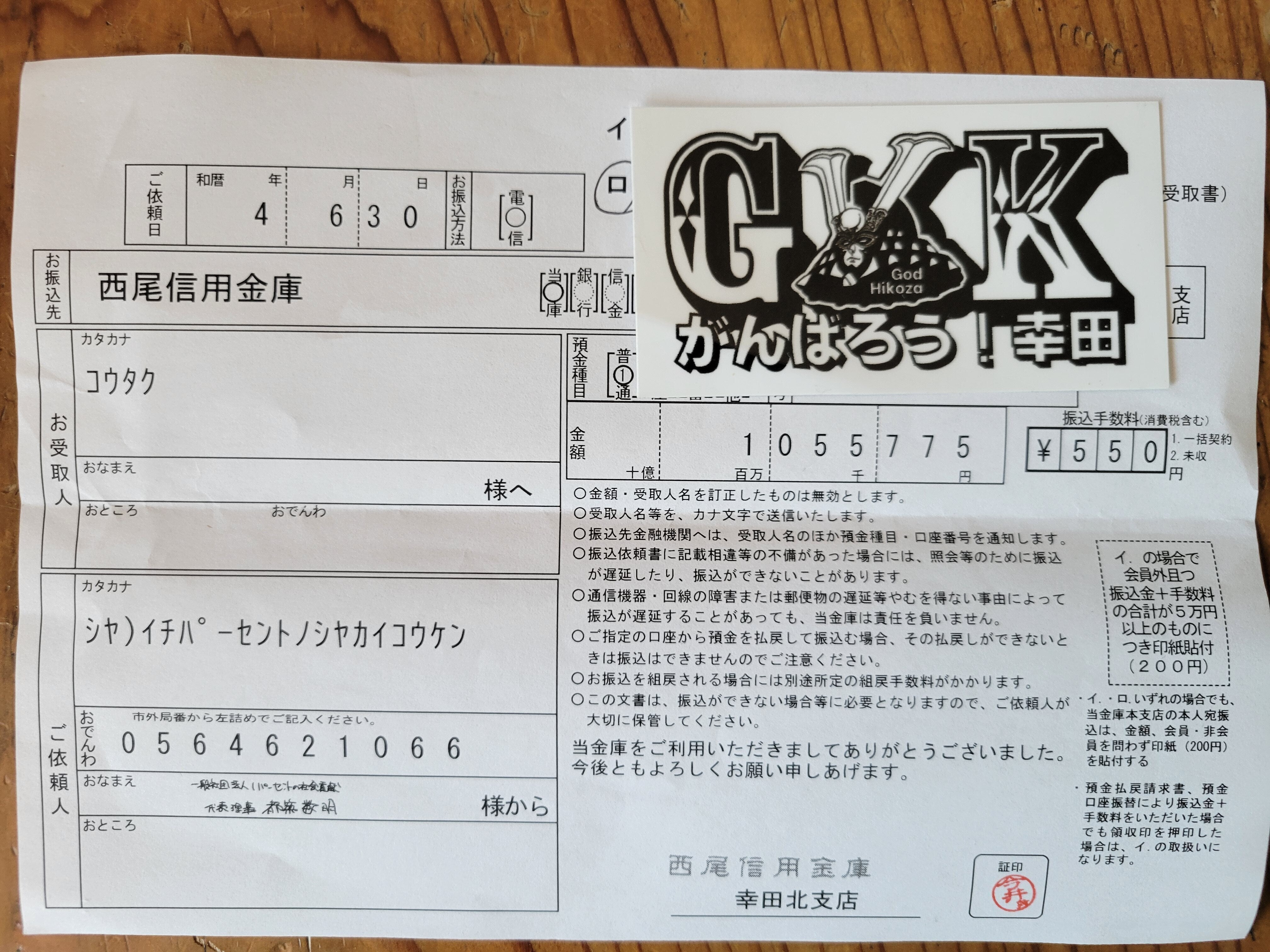 また幸田町内を中心に同時進行で実施してきました募金活動も本日集まったお金1,055,775円を被災地域である幸田区へ振込をさせていただきました。