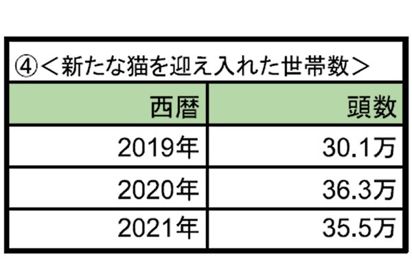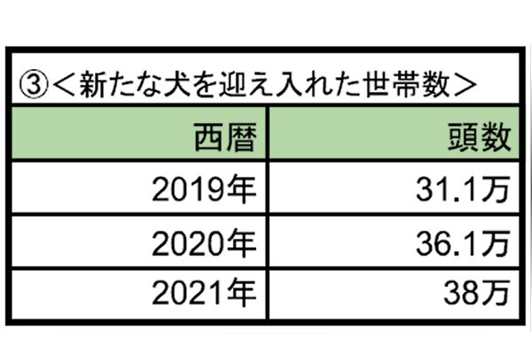 以下は、「一般社団法人ペットフード協会」さんの調査データより引用させていただくものですが、2020年、2021年と続けて、新規飼育の頭数、世帯数ともに、激増していることがわかります。