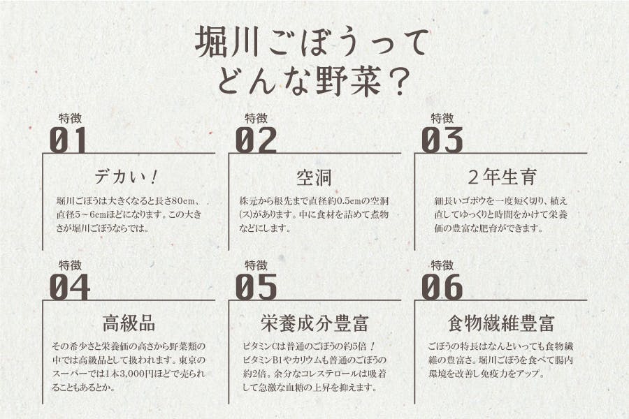 そんな希少価値の高い堀川ごぼうはに様々な特徴があります。