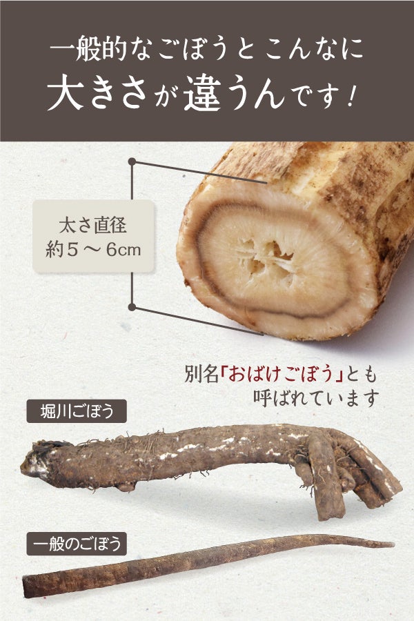 別名「お化けごぼう」とも呼ばれ、長さ約50㎝、直径が6~10㎝にも成長するほど、