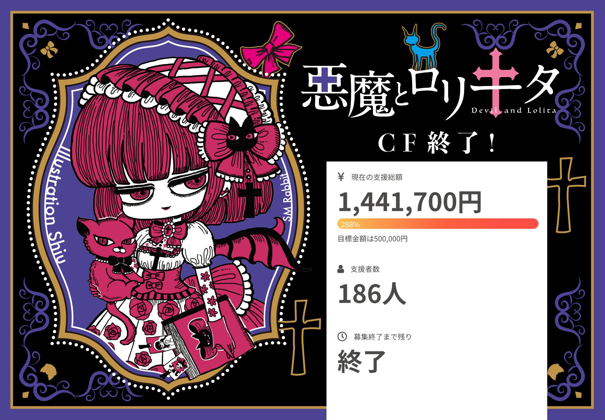 昨日(6月12日)の23時59分をもっておかげさまで、無事悪魔とロリータのCFが盛況の内に終了いたしました。