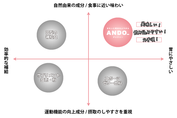 「ANDO_」はそんな運動時に不可欠な糖を補給できるだけでなく、成分からパッケージまで、運動時の摂取を想定し開発。