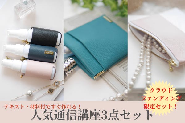 【クラウドファンディング限定!】縫わないレザークラフト「レザクラージュ®」が初めての方にもおススメの人気講座「スプレーボトルケース」「ばねポーチ」「かんたんポーチ」の通信講座3点+お礼のお手紙セットです。