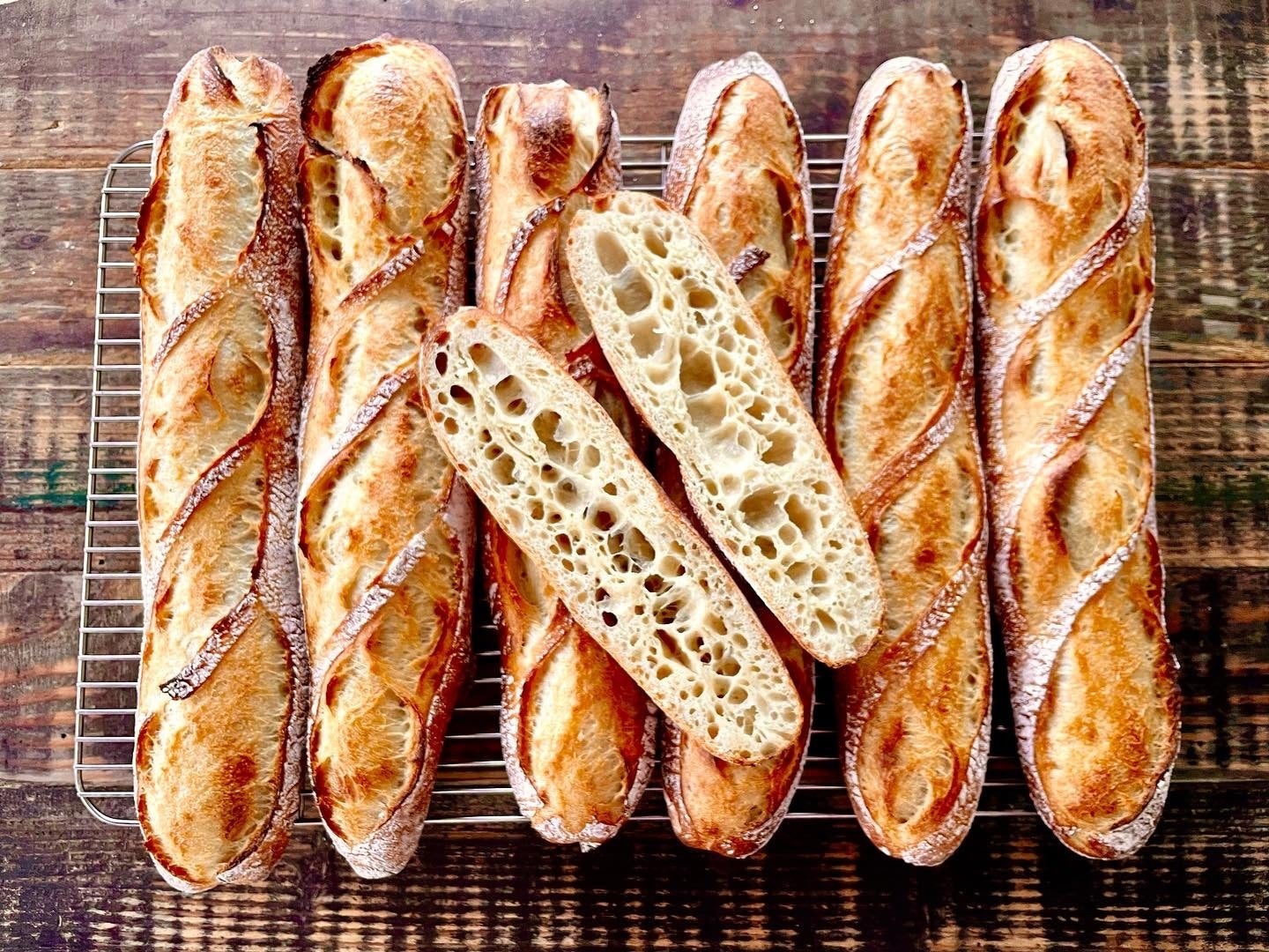 加水100の長期熟成バゲット。古代小麦(オーガニックスペルト小麦)を35%に北海道産小麦でハード過ぎないように。酵母は、シンプルに小麦と水だけで起こしたルヴァン種を使っています。出典:https://www.instagram.com/p/CZfqdo_PtHA/