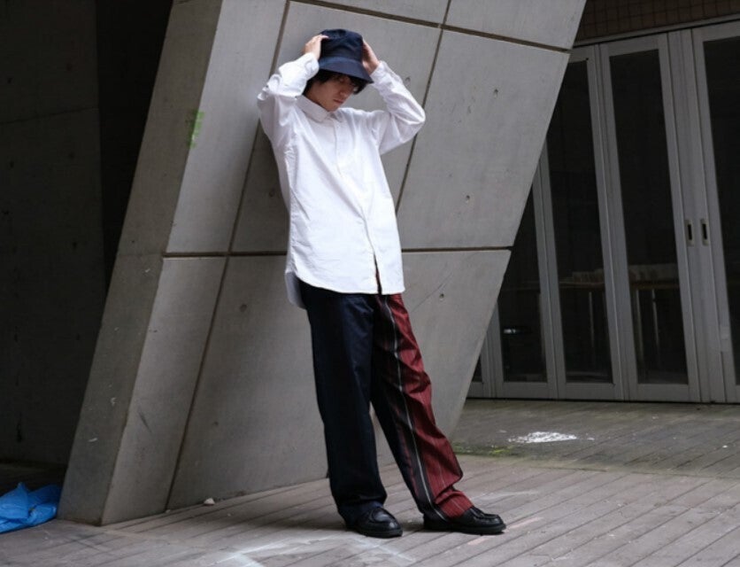 益満さんには、右前身のみにブラックレッドの縞を配したイージーパンツを着用頂きました。
