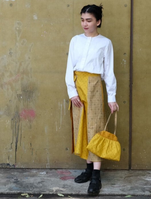 3種類の個性的な紬を使った、Aラインラップスカートを着用頂きました。