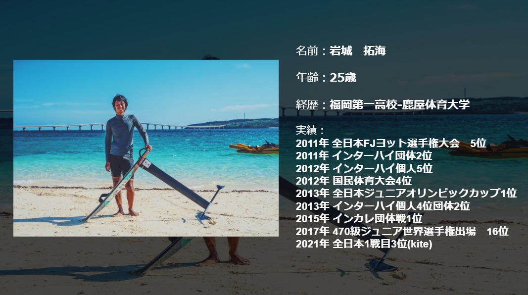 はじめまして。フォーミュラカイト選手の岩城拓海と申します。宮古島を拠点に現在活動しています。今回、パリで世界と戦うチャンスを得る為に、このプロジェクトに挑戦します。