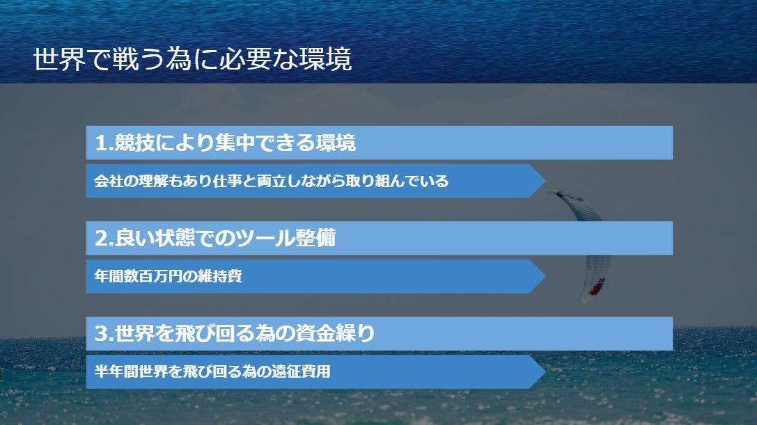 コロナもようやく落ち着いてきたことから、今年は海外遠征を積極的に実施(スライド赤枠部分)し、国際舞台での経験を出来るだけ多く積みたいと考えております。フォーミュラカイトのトップ選手はヨーロッパ圏の選手が殆どです。ヨーロッパ/アジア遠征でトップレベルの技術を肌で感じながら、自身のレベルアップを図りたいと考えています。