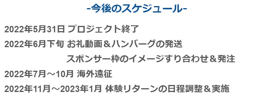 体験型リターンをご選択いただいた皆様は、世界選手権が一段落した11月以降のタイミングで、日程調整の上、実施させて頂きます。