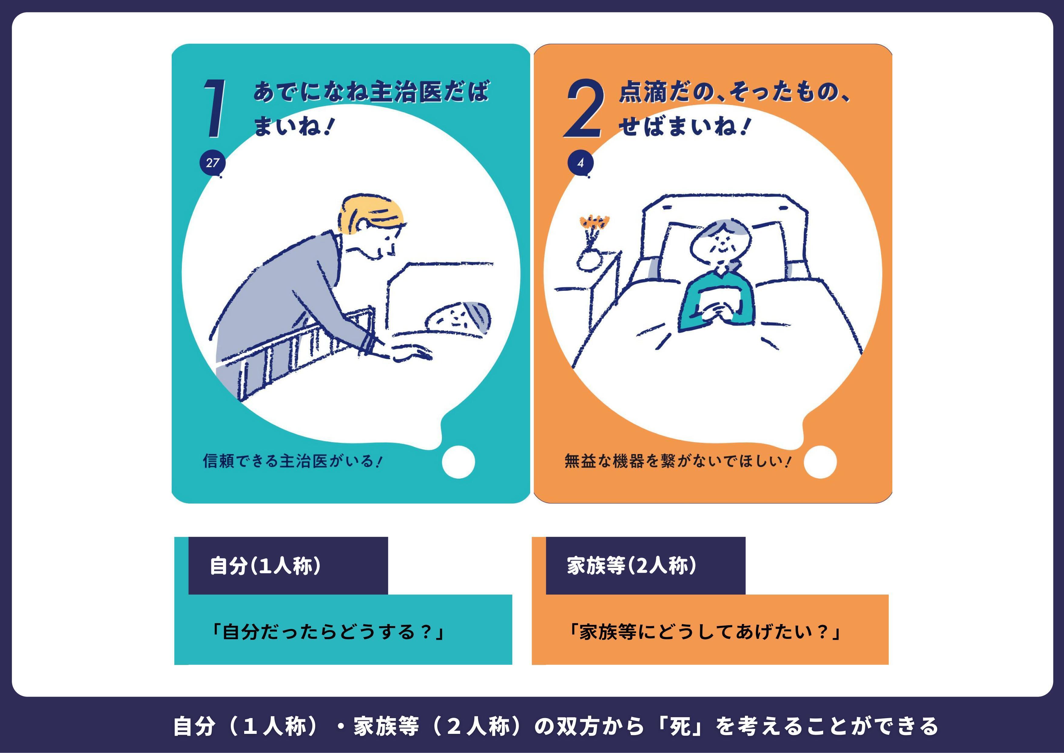 ②表(カード1)が「自分の『死』(1人称)」 を考えるカード、裏(カード2)が「家族等の『死』(2人称) 」 を考えるカードとしてデザインされ、双方を対象にして掘り下げることができます。