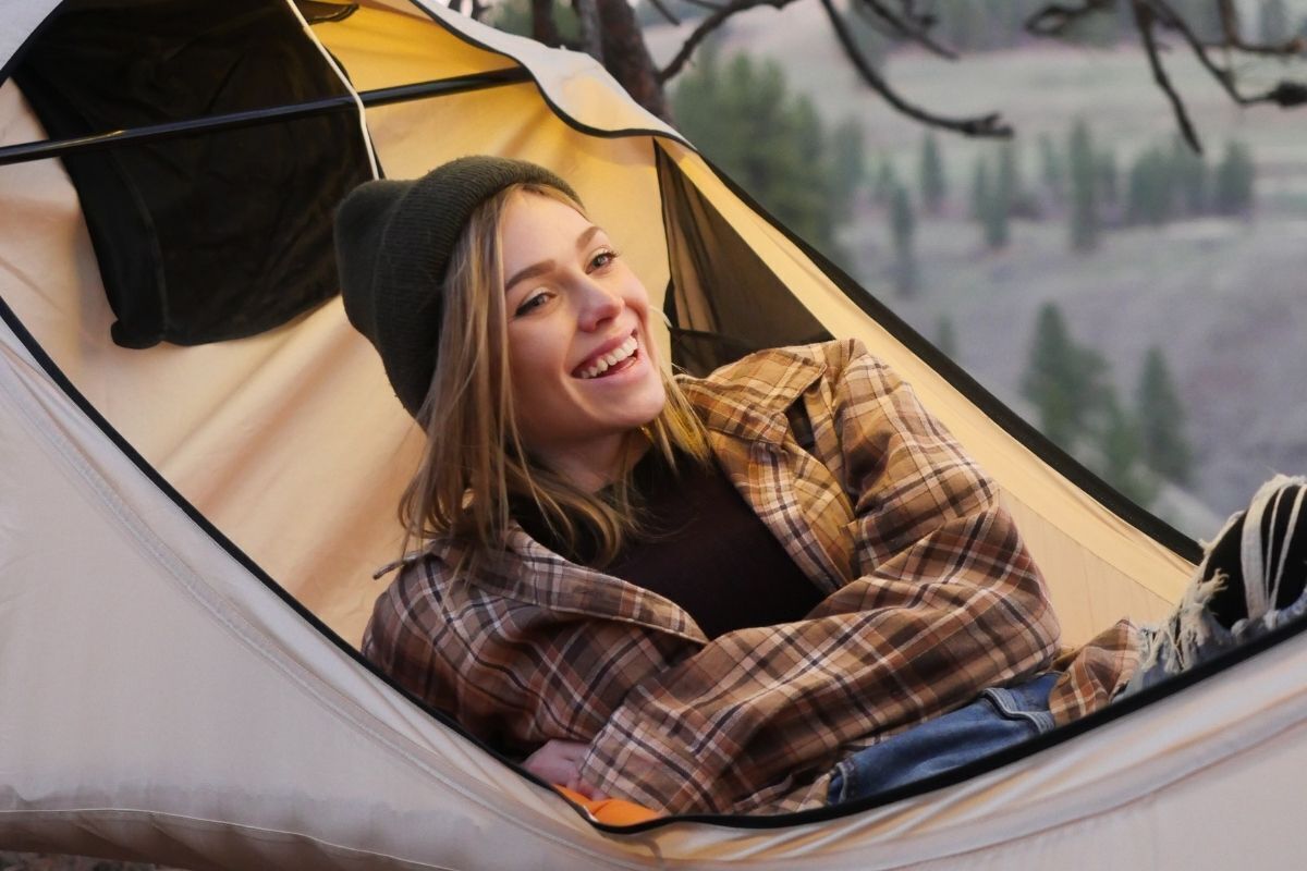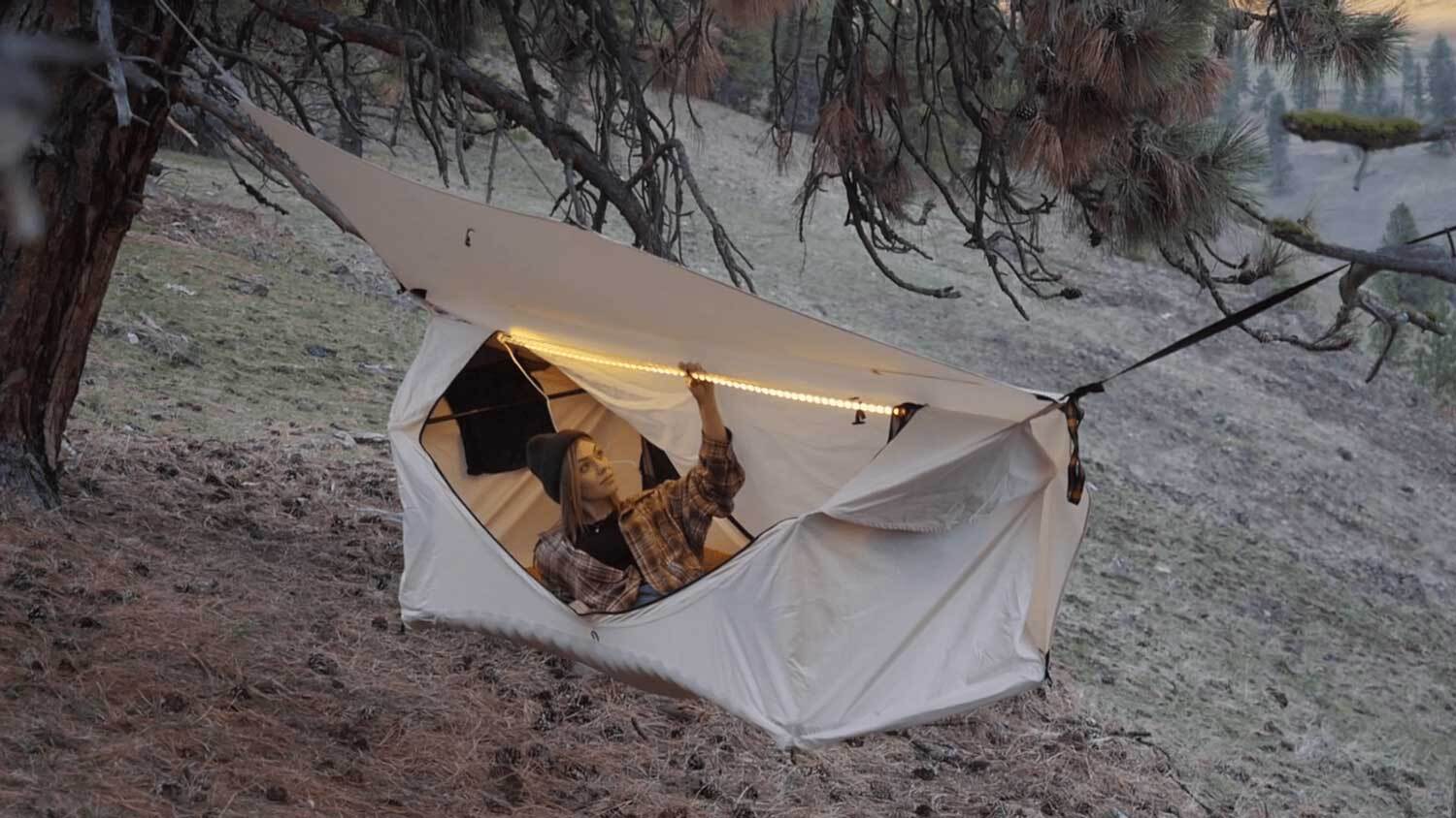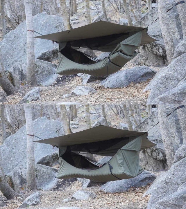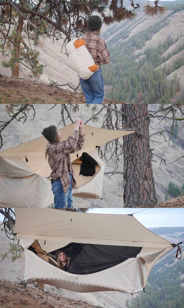 ヘブンテントは一般的なハンモックのように腰が沈み込まず、体を真っ直ぐに寝ることができます。