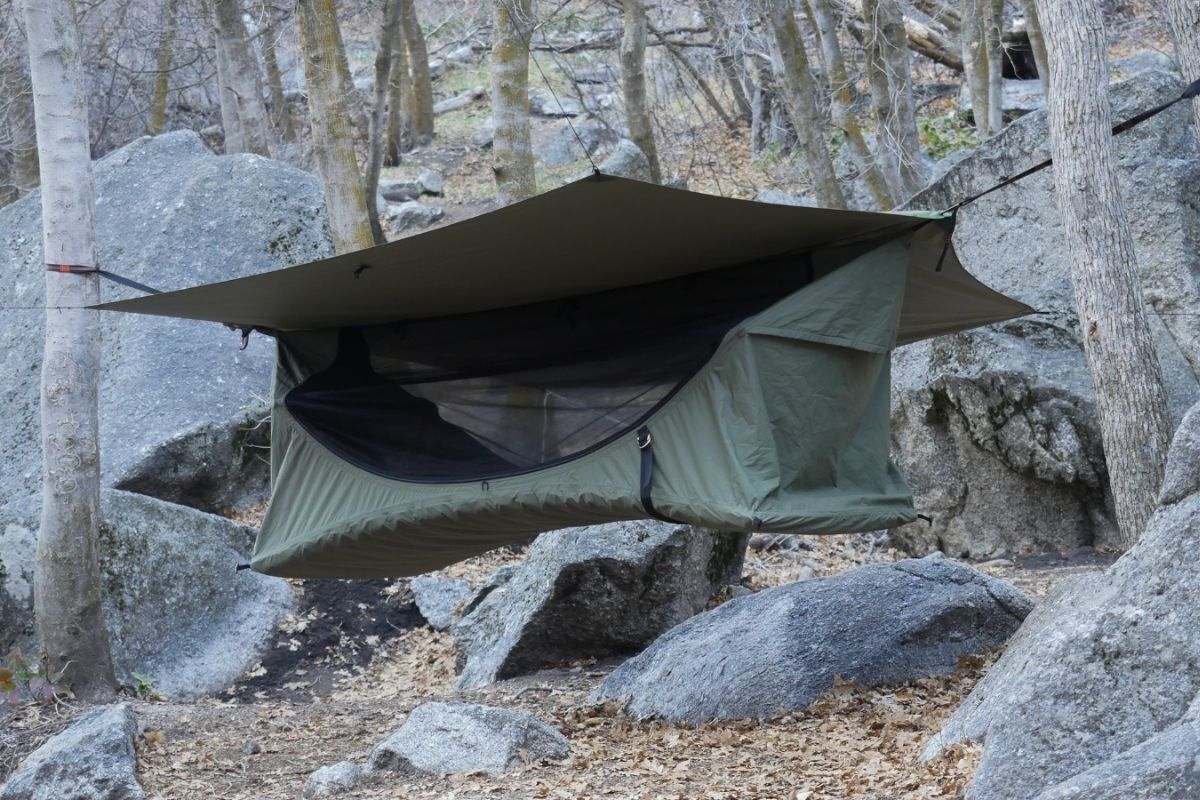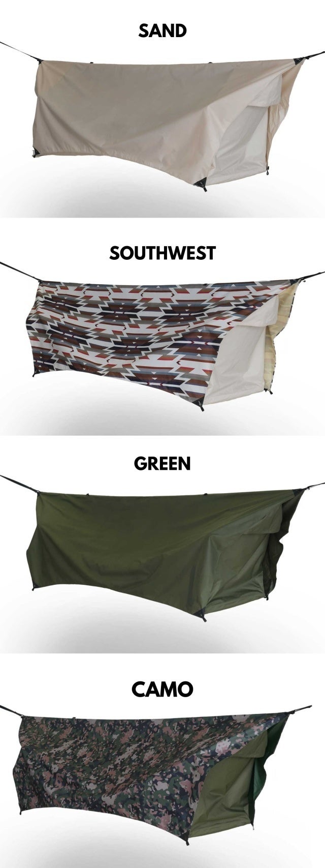 パッケージ内容:蚊帳付きハンモック、レインフライ、エアマット、バンティングバナー、ウェルカムマット、スプレッダーバー、ツリーストラップ、ペグ、ガイロープ、収納ポーチ