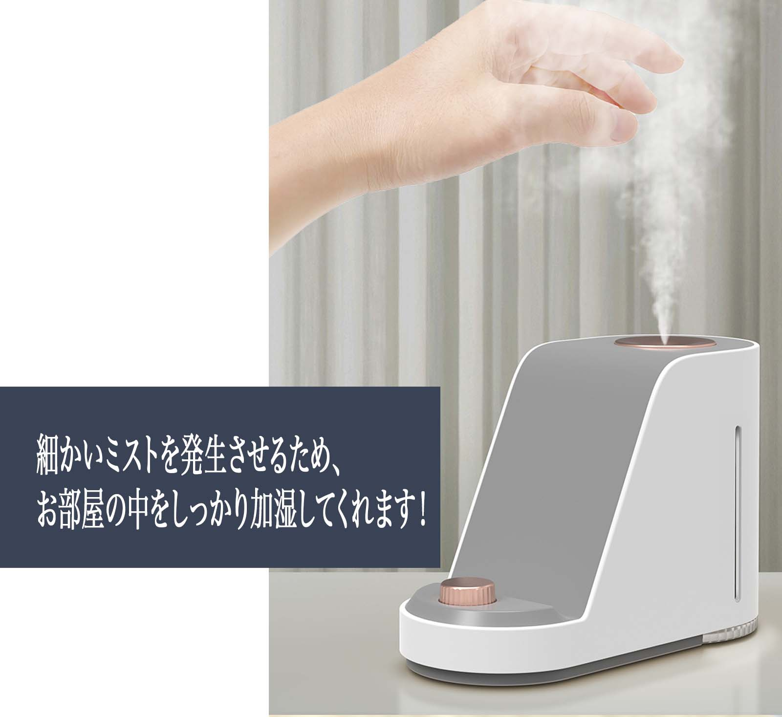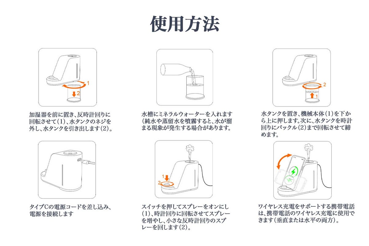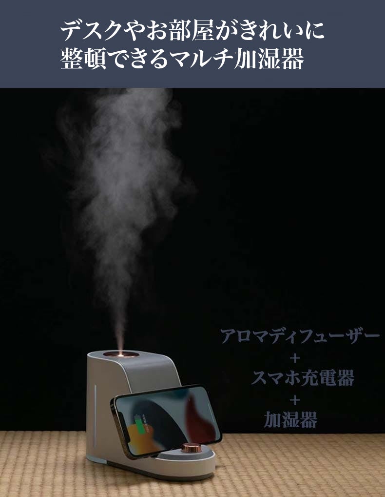 ②驚くほど静かな動作音でしっかり加湿! - ③「ワイヤレス充電」「加湿」「アロマディフューザー」「スタンド」の一台四役!